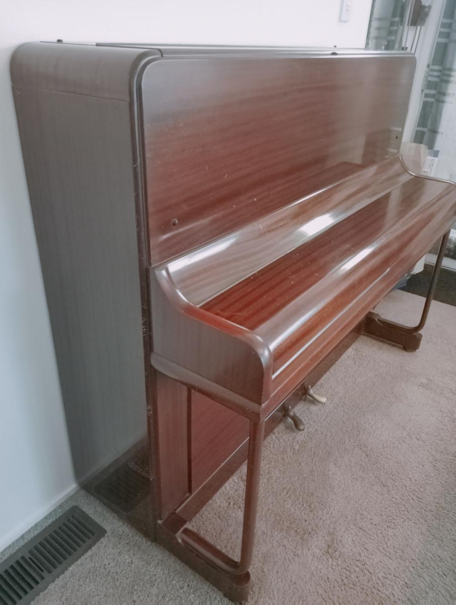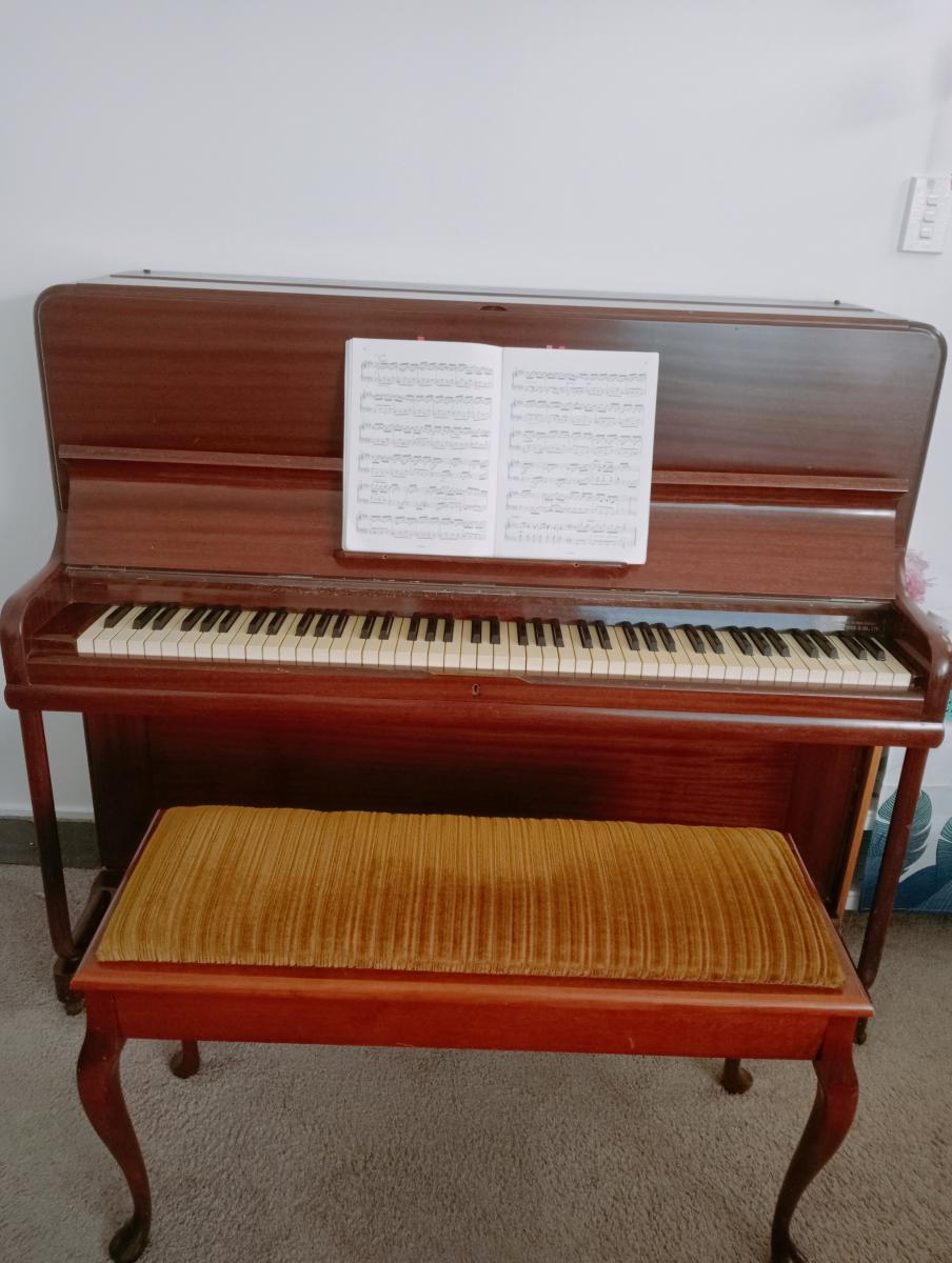 We bought it a few years ago, now it's still in good condition. Measurements: 132 cm x 56 cm x 113 cm (L x W x H), it's quite heavy since made from solid wood. The piano stool is included. It must be picked up ( by piano mover), thanks!