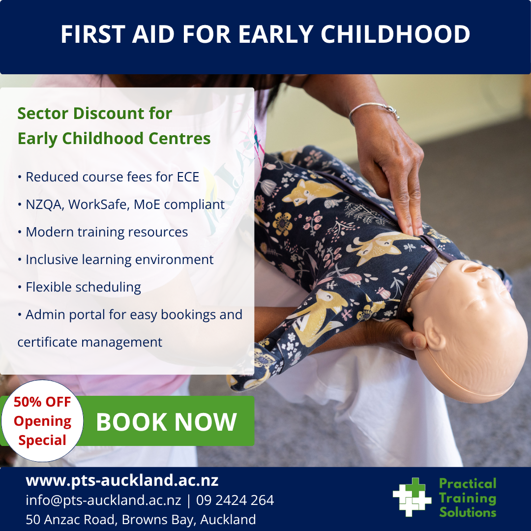Early childhood educators, we know safe environments and compliance matters. Our Workplace First Aider and Revalidation courses tick the NZQA, WorkSafe, and Ministry of Education box. Our engaging training focuses on equipping you for real-life scenarios with the choice of flexible blended or … View moreEarly childhood educators, we know safe environments and compliance matters. Our Workplace First Aider and Revalidation courses tick the NZQA, WorkSafe, and Ministry of Education box. Our engaging training focuses on equipping you for real-life scenarios with the choice of flexible blended or face-to-face courses. Plus, our ECE sector discount gives you cost effective first aid training.
