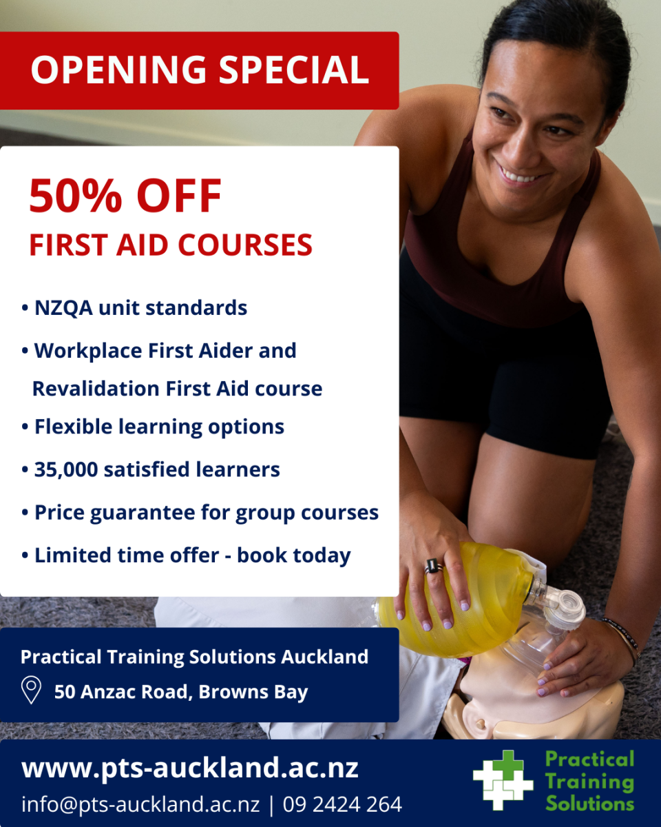 Practical Training Solutions first aid training has opened a training centre in Browns Bay. To celebrate, weβre offering a huge 50% off introductory discount on all first aid training. We also offer a price guarantee for group bookings. Flexible, NZQA-approved, and trusted by over 35,000 … View morePractical Training Solutions first aid training has opened a training centre in Browns Bay. To celebrate, weβre offering a huge 50% off introductory discount on all first aid training. We also offer a price guarantee for group bookings. Flexible, NZQA-approved, and trusted by over 35,000 learners across NZ.