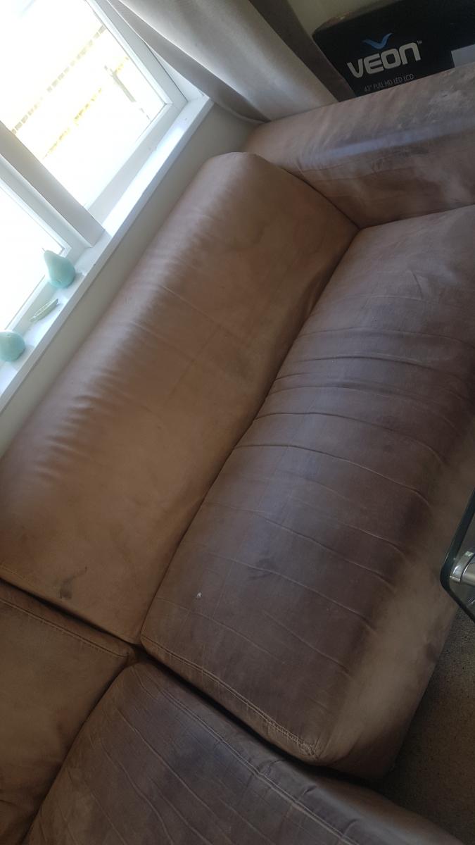 There is a broken leg and some stains on couch doesn't at all effect comfortably of couch 😊(See photos)