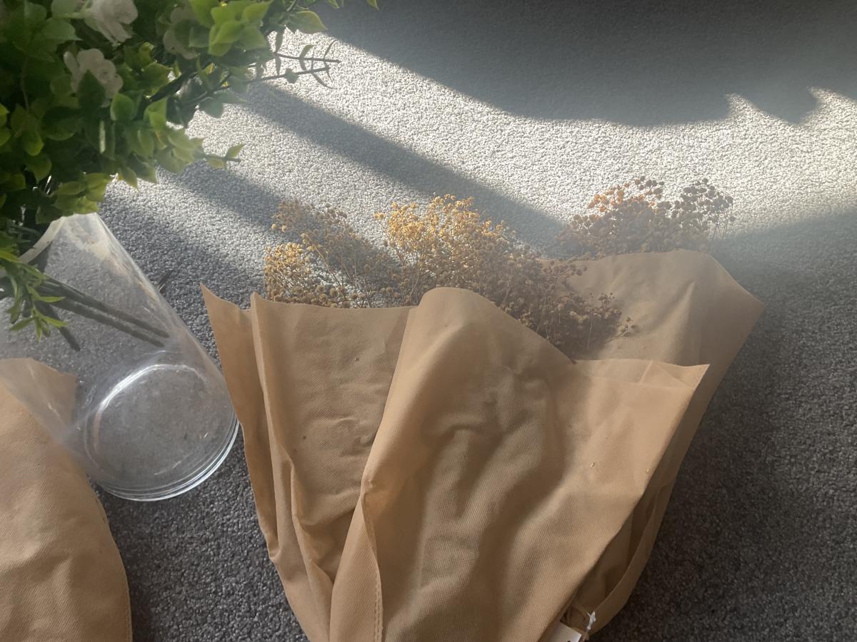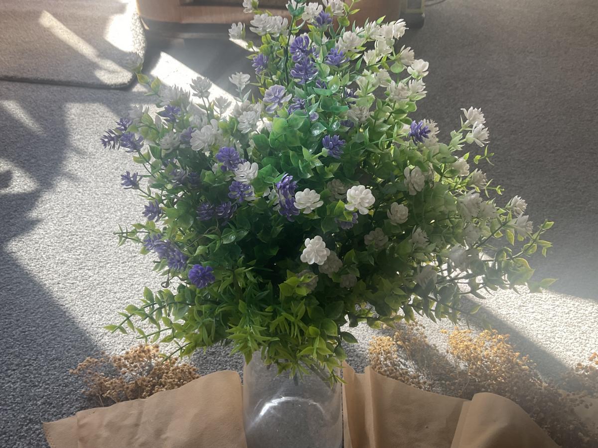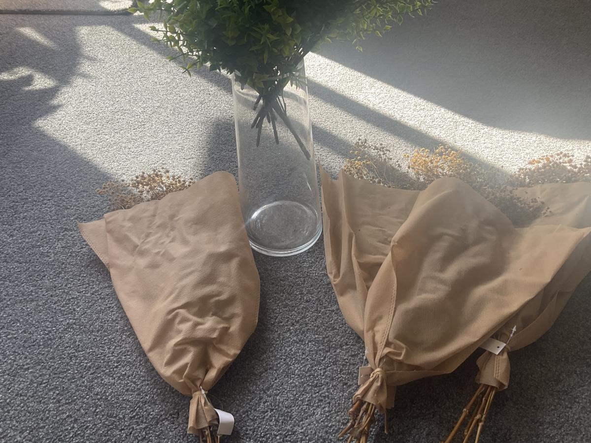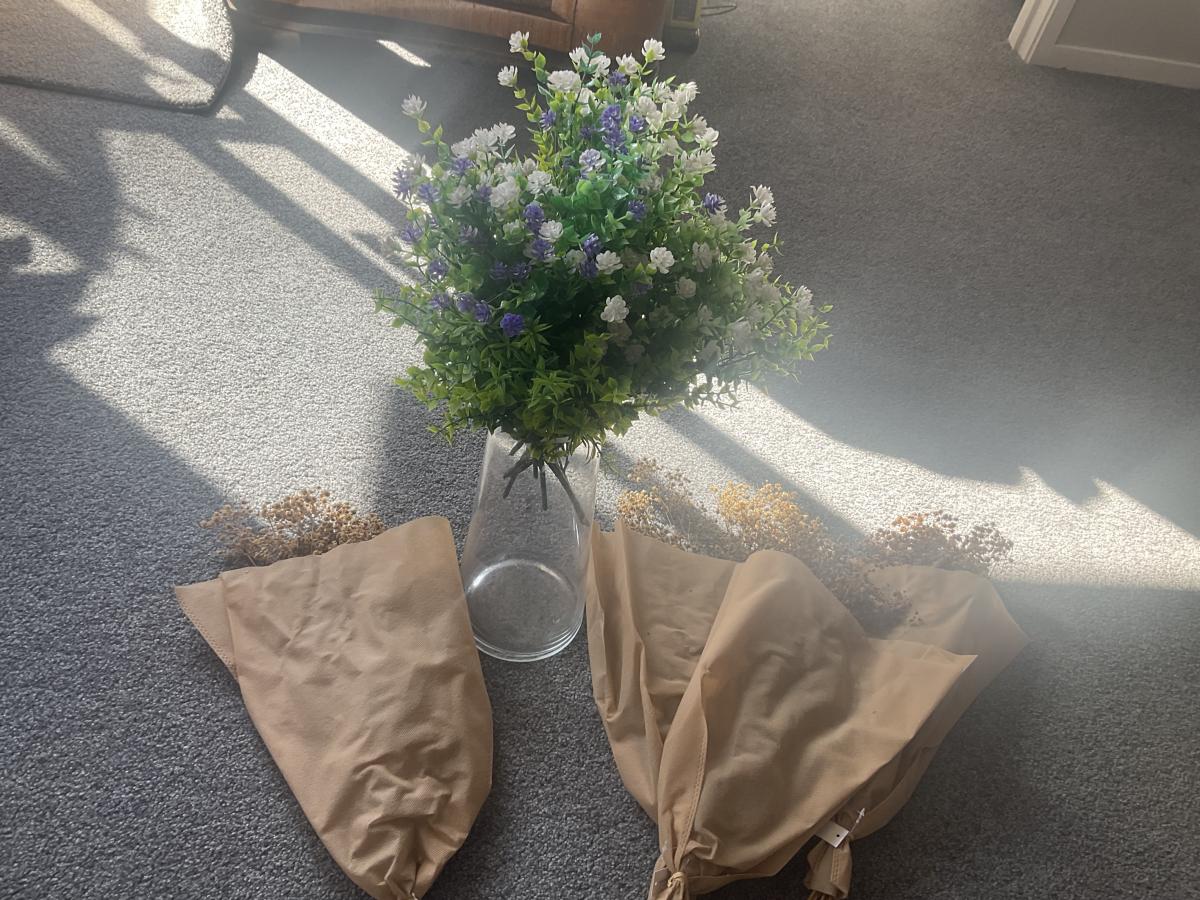 VASE WITH A BUNCH OF ARTIFICIAL FLOWERS AND BUNCHES OF DRIED PLANTS