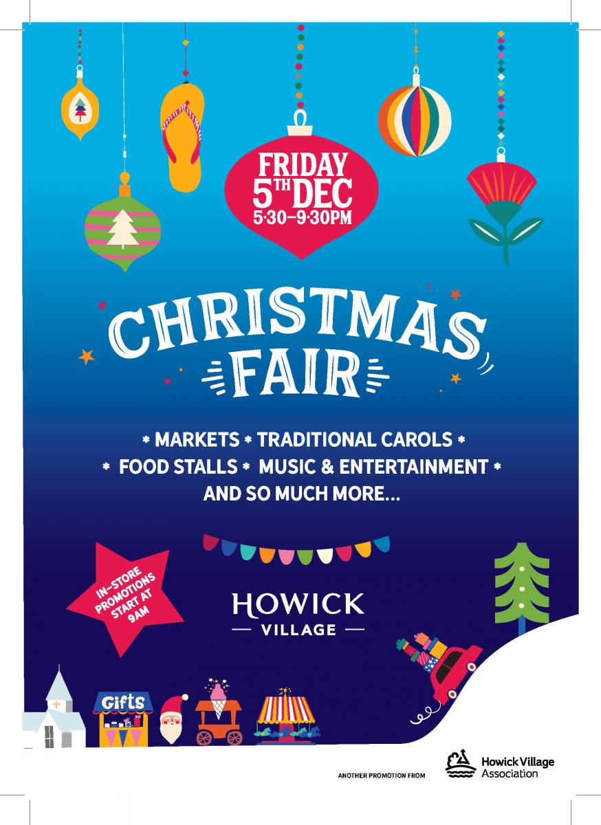 We are looking forward to another great event in Howick Village. Bring your family and friends along to our Christmas Fair on Friday 5 December 2025 - in store bargains and promotions start from 9.00am on event day and a huge array of entertainment and our iconic markets start from 5.30pm. There … View moreWe are looking forward to another great event in Howick Village. Bring your family and friends along to our Christmas Fair on Friday 5 December 2025 - in store bargains and promotions start from 9.00am on event day and a huge array of entertainment and our iconic markets start from 5.30pm. There will be a large number of food vendors on site and lots of fun activities for the children. Santa will be visiting from 6.00pm- 8.30pm and will be in Bayley's on Picton Street. We look forward to seeing you there.