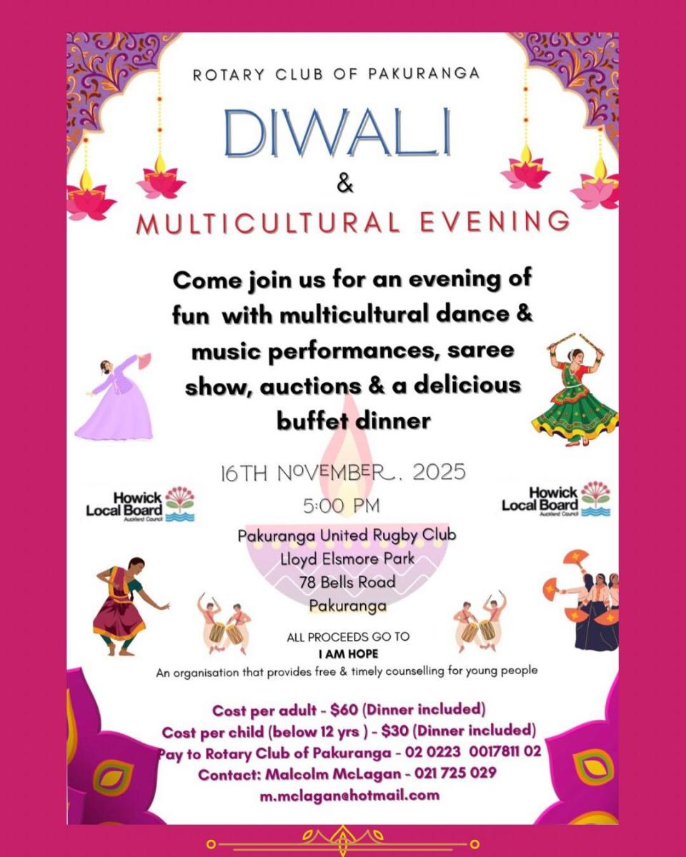 Organised by the Rotary Club of Pakuranga, this Diwali and multicultural evening has all proceeds going to I Am Hope. I Am Hope is an organisation that provides free and timely counselling for young people.