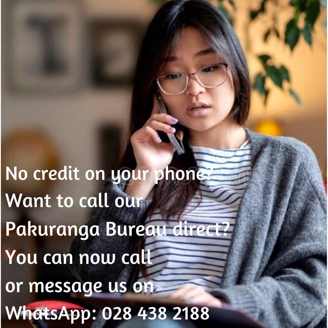 With a WhatsApp #, you can call or message our Pakuranga Bureau directly on WhatsApp.
