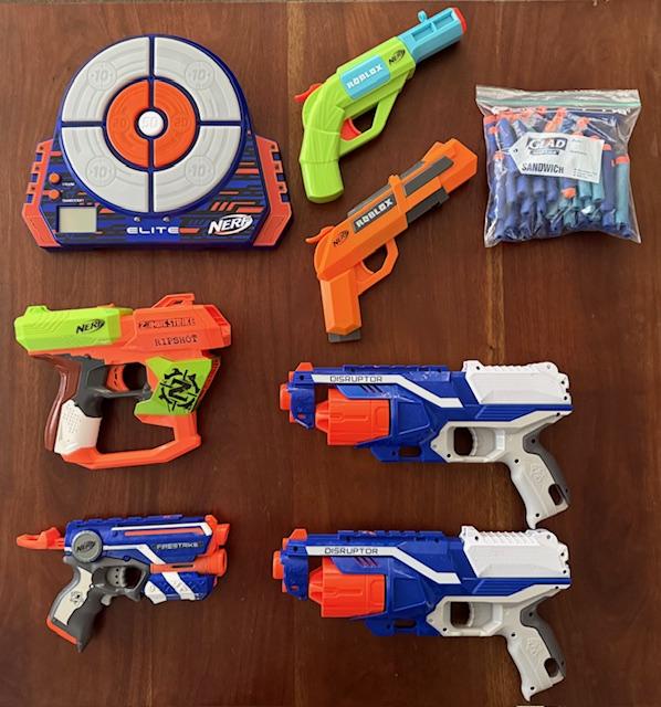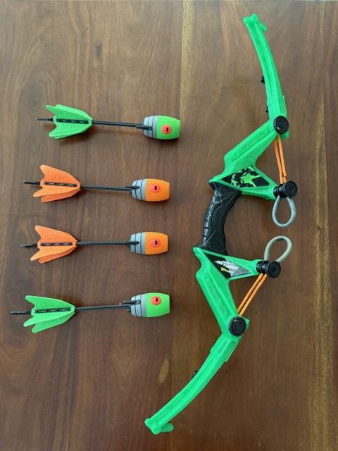 Photos 1, 2 & 3 - Assorted Nerf Guns/Bow and Arrow (note the bow may need new elastics as looks ready to snap)