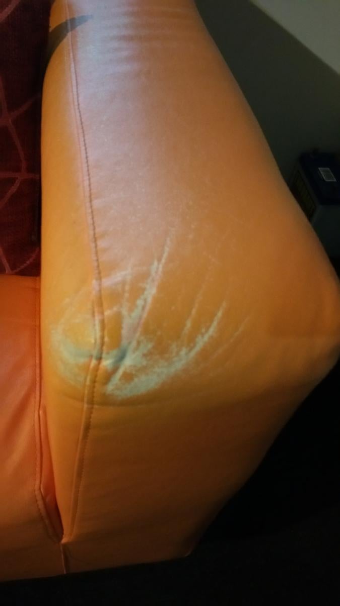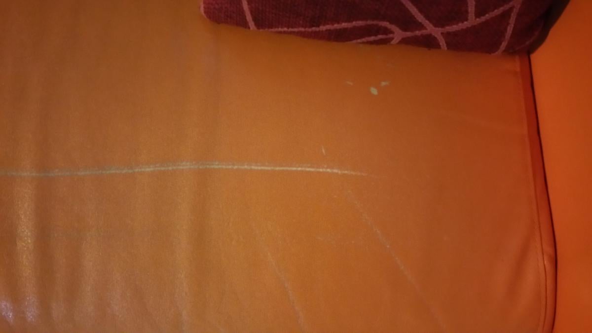 Orange leather look sofa of the famous Klippan range from Ikea. Good shape and very comfy. A few areas of wear mainly on right hand side arm & seat, but also included is a poly/cotton made to measure cover to transform the sofa into a navy blue design.