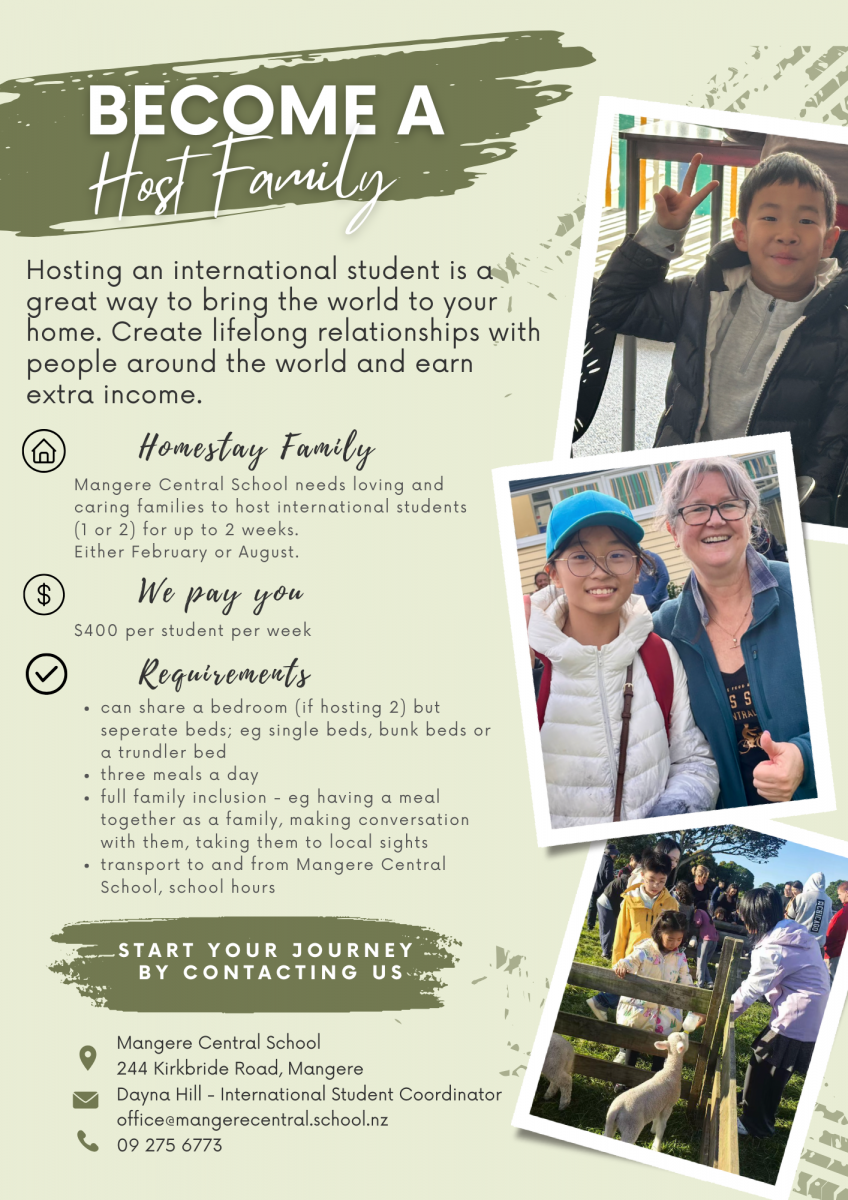 Mangere Central School needs loving and caring families to host international students for 1-2 weeks.