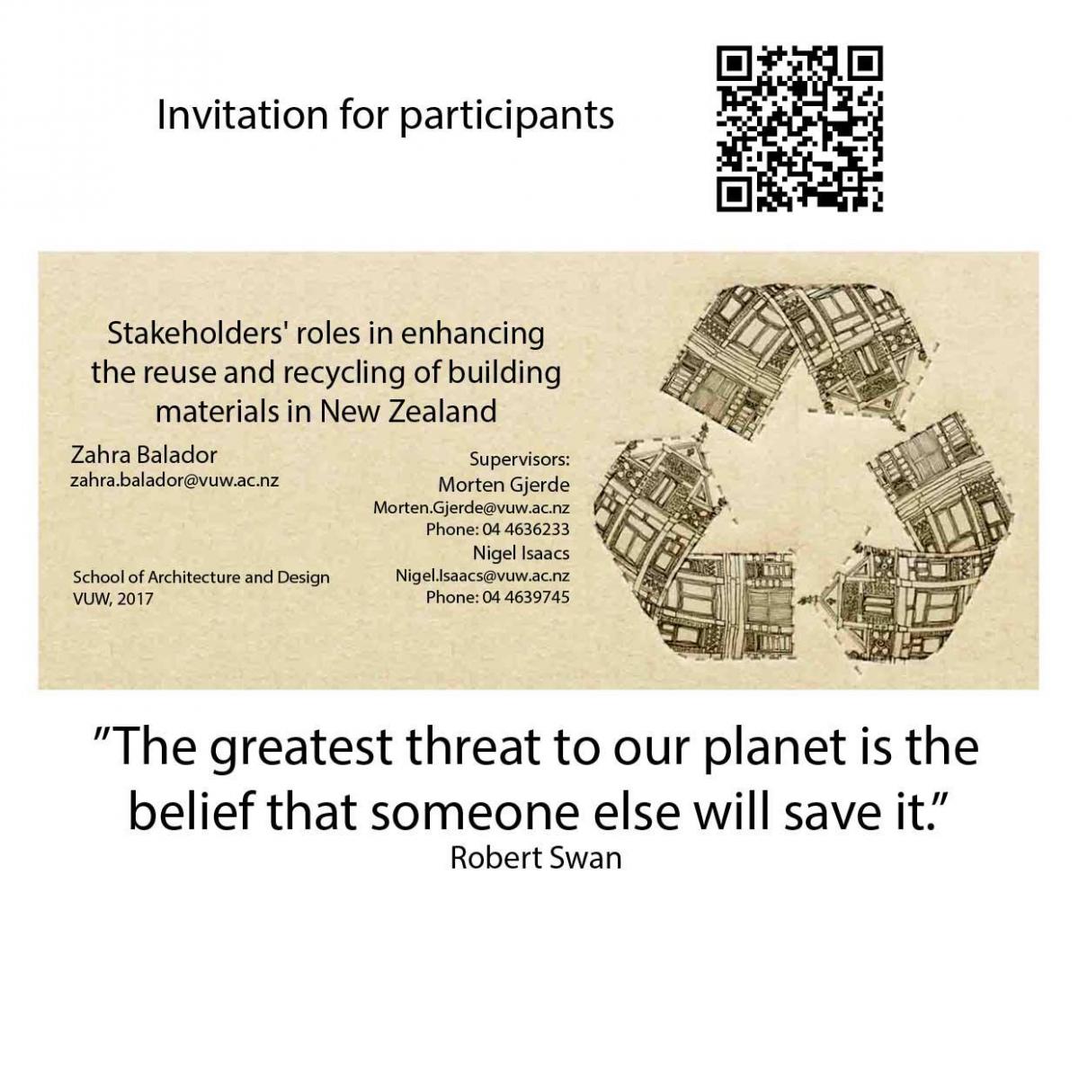 I am writing to you to kindly request your participation in a questionnaire survey. You are especially qualified to speak to the research query examined in this investigation. The survey will ask you questions about your attitudes and perceptions about reclaimed and recycled building materials.