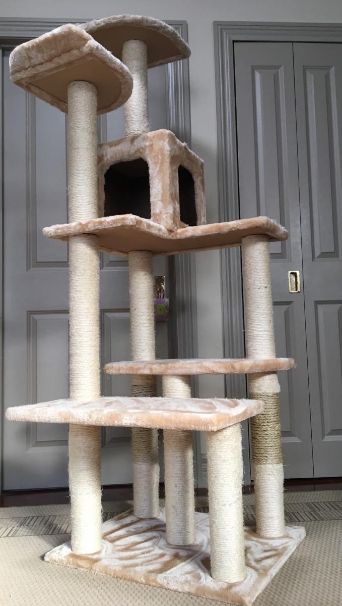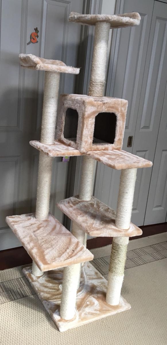 Multi-level, Well loved cat tree. Just under 1.8m tall, approx 64cm x 62 cm base.