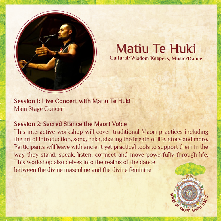 🎶🌏☮️ VOICES OF SACRED EARTH FESTIVAL 2018 is fast approaching and we're so excited to have Matiu Te Huki back this year!