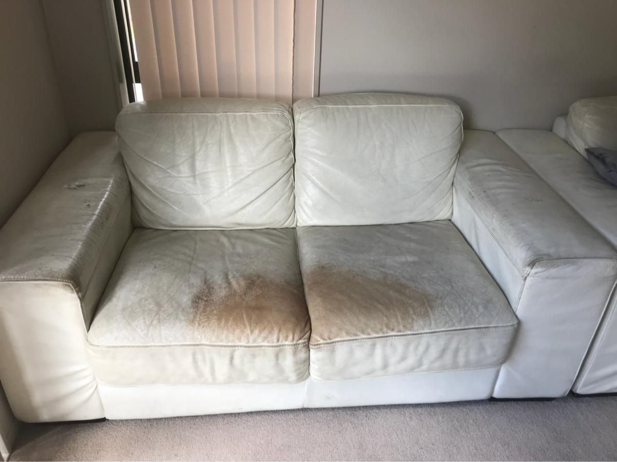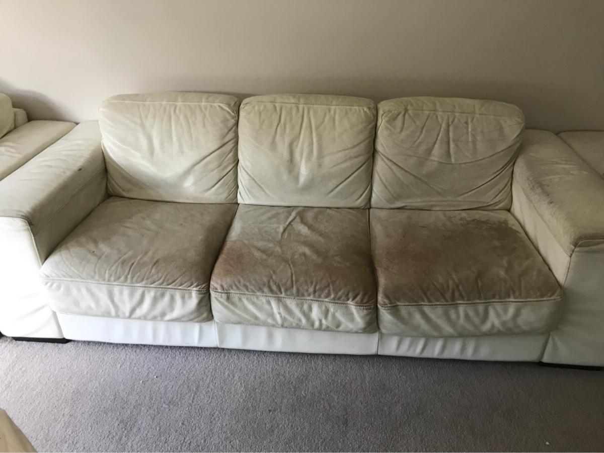 Cream/white colour 10 yrs old, well loved and worn leather couches