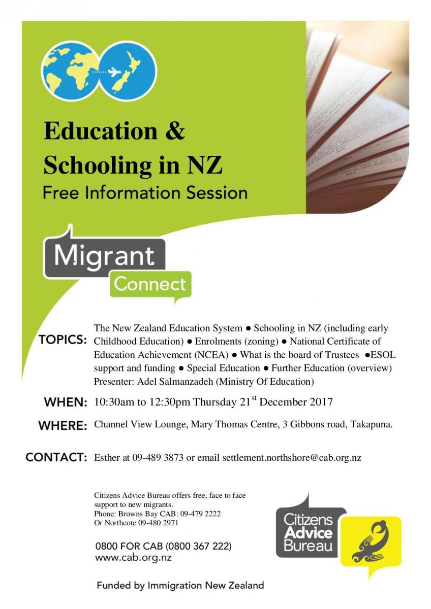 Date: Thursday … View moreAre you a new migrant? Do you wish to find out more about the best schooling and education for your children? The CAB is hosting a free information session for new migrant families which gives an overview about NZ education from Early Childhood Education to High School and beyond.