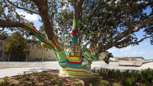 A much-loved pōhutakawa tree has been given a pre-Christmas makeover by knitting volunteers and a group from Hobsonville Point Secondary School.