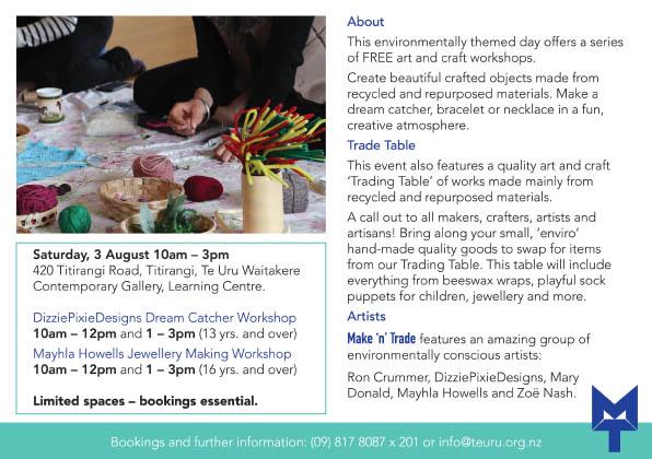 Check out a FREE 'Enviro themed' one day only art and craft workshops on offer at Make n Trade Event 2019. Alternatively, bring along a small handcrafted object made from recycled and repurposed objects to trade at a new community initiative, Trading Table. Artists on hand will have their… View moreCheck out a FREE 'Enviro themed' one day only art and craft workshops on offer at Make n Trade Event 2019. Alternatively, bring along a small handcrafted object made from recycled and repurposed objects to trade at a new community initiative, Trading Table. Artists on hand will have their creations to look at trading with you. Bookings for workshops essential.