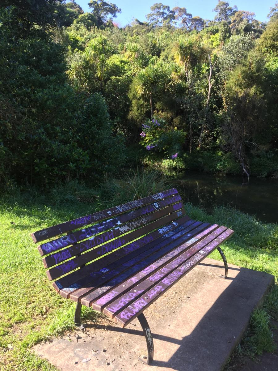 How pretty! Whoever the artist is made a nice match with the flowers over the other side of the creek!