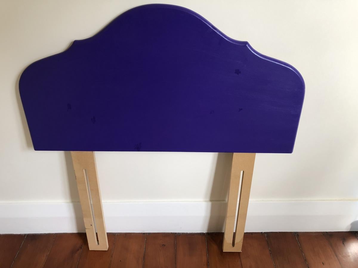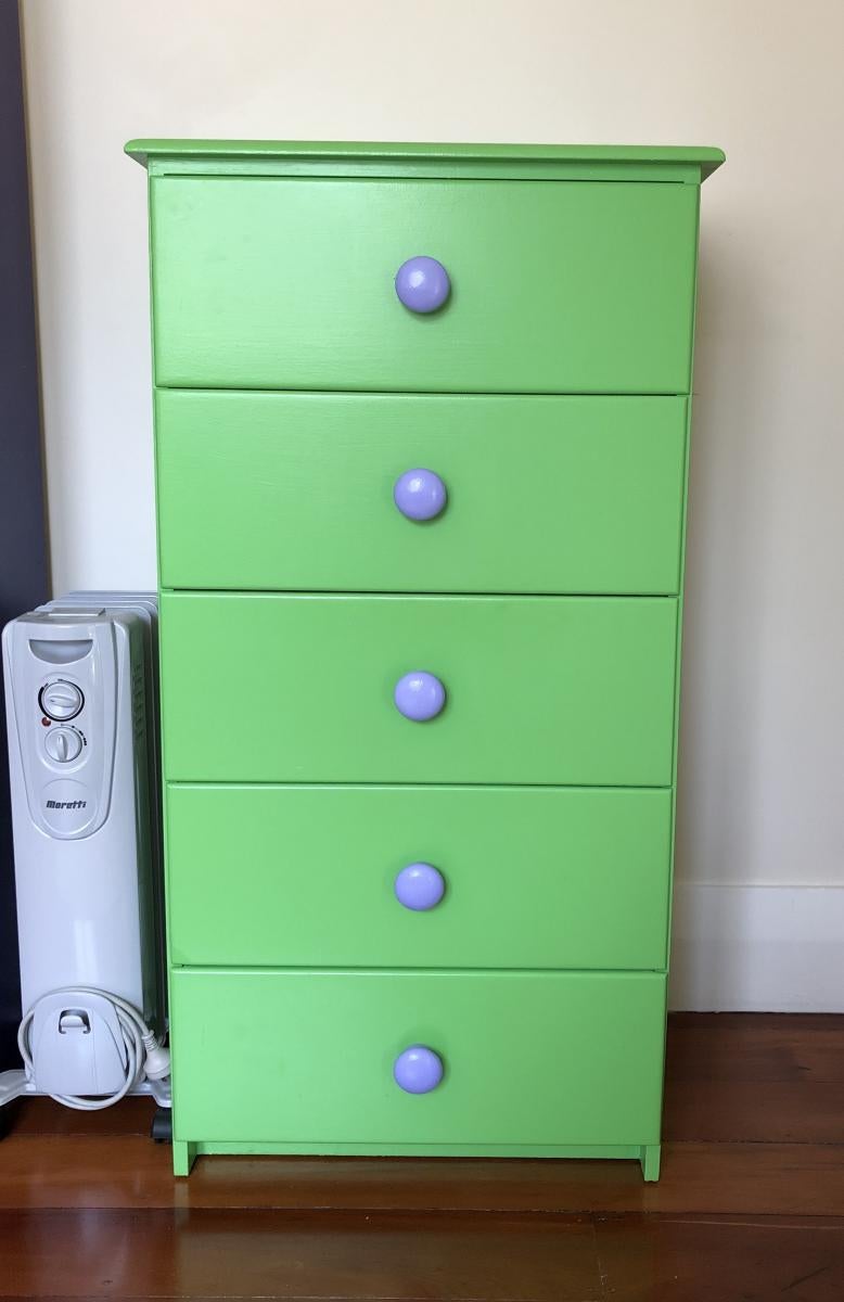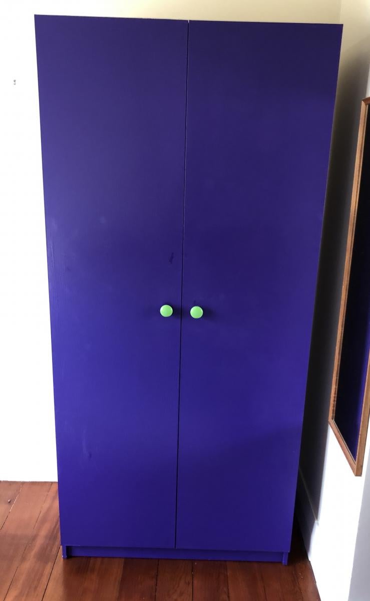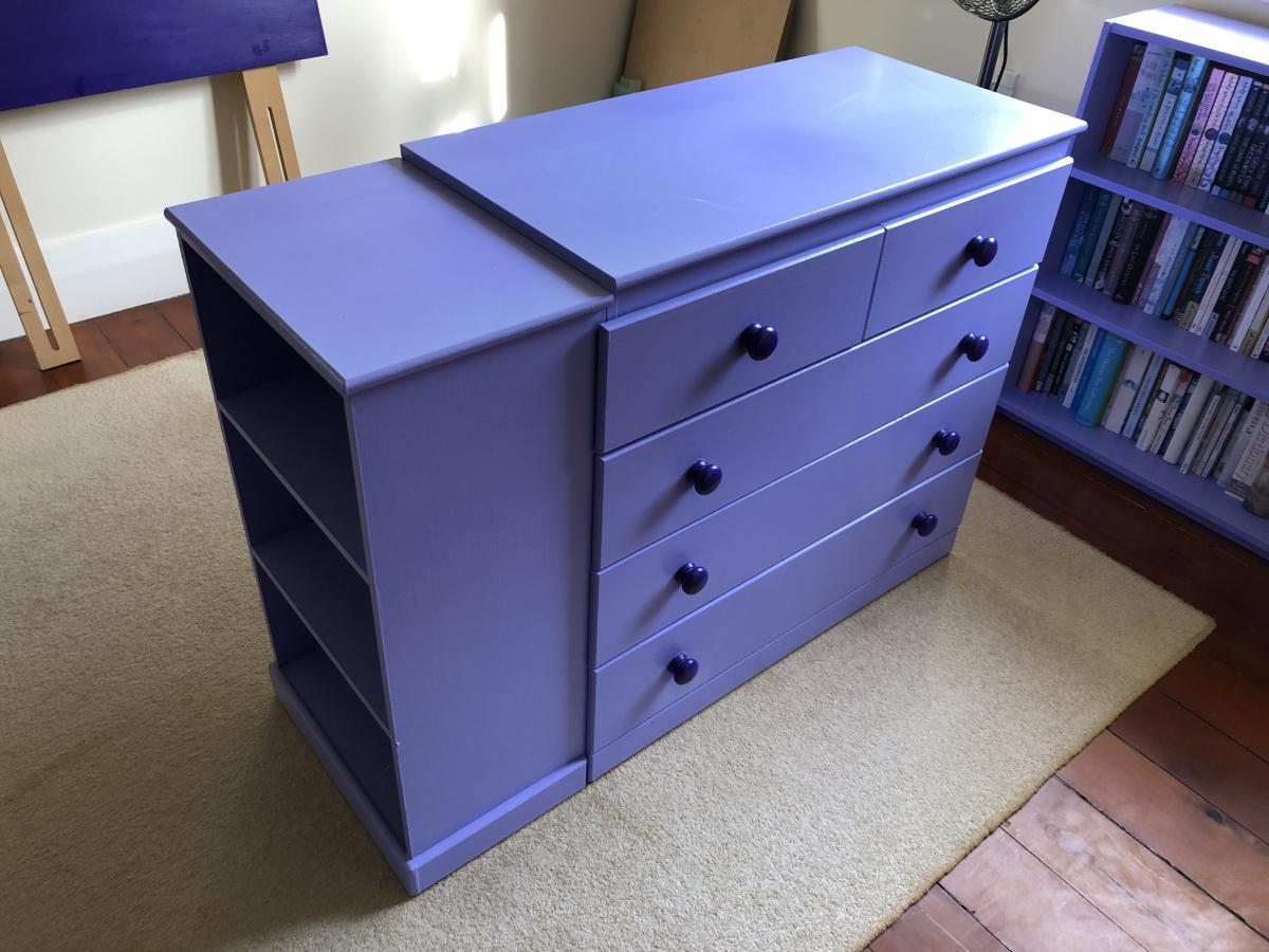 Wardrobe, chest of drawers, dresser with extendable desk, bed head, notice board. Additional tin of dark purple paint. Items can be sold separately.