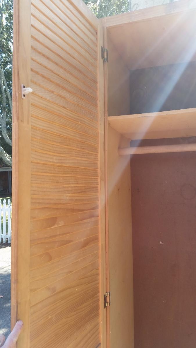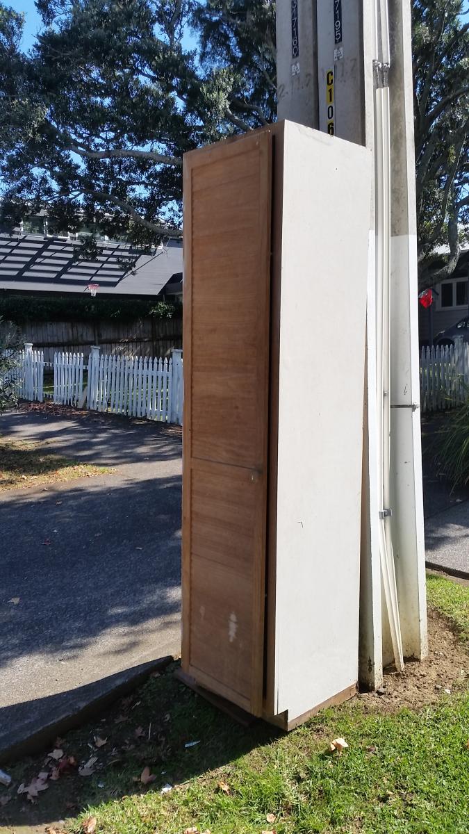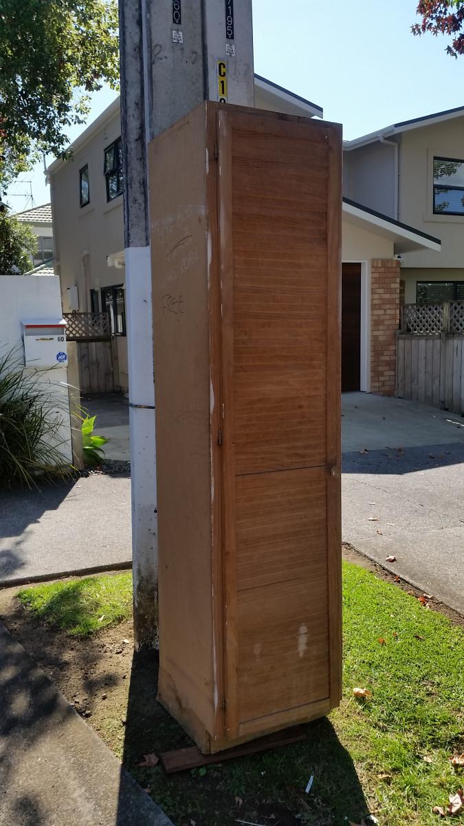 Free wooden wardrobe on berm outside 58 Dignan Street, Point Chevalier for collection- help yourself, first in first served. Approx dimensions 40cm x 40 cm x 180cm.