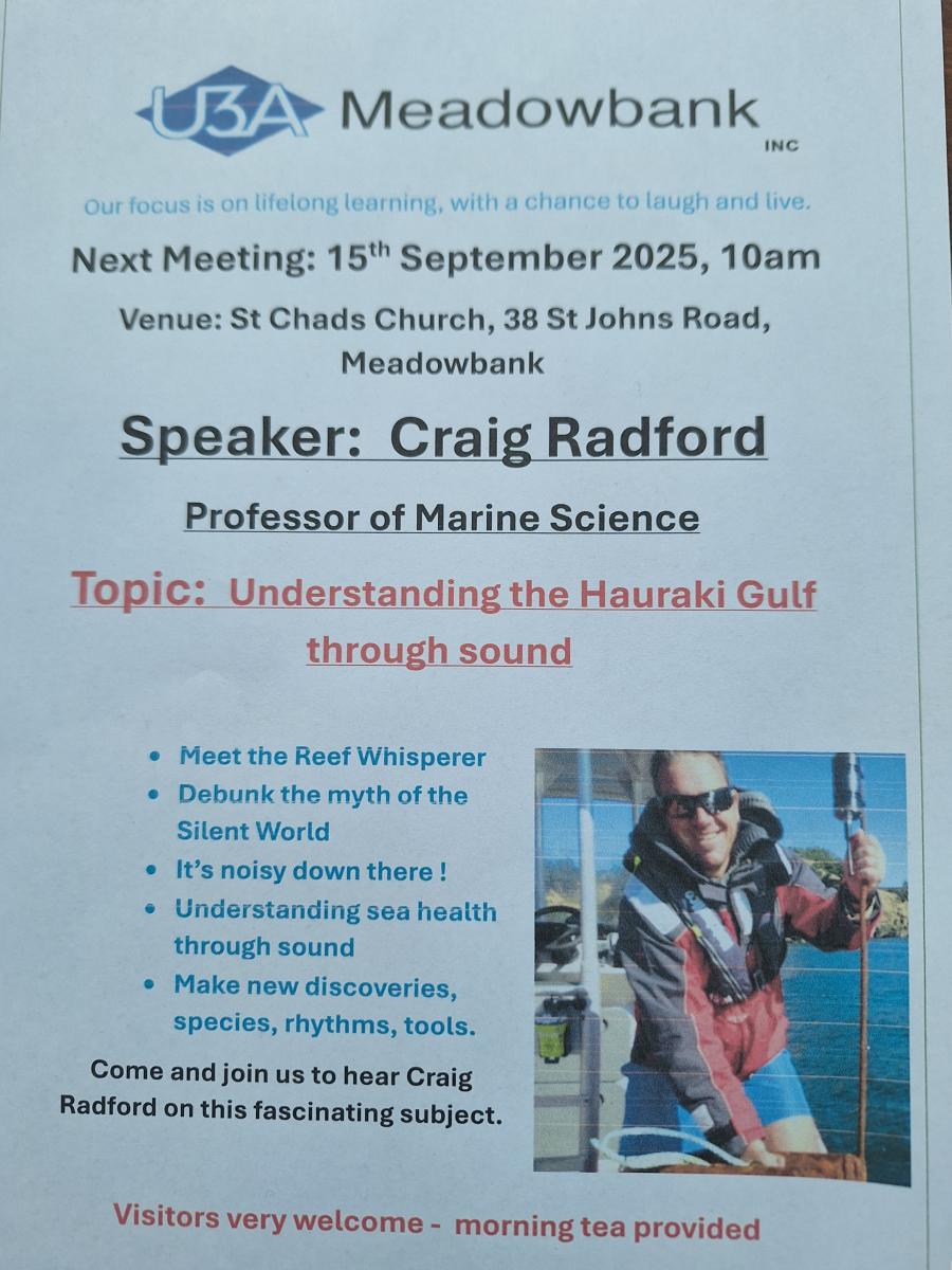 Come and hear Professor Craig Radford from the university Marine Sciences Department, talking about exploring the Hauraki Gulf through sound. By listening through underwater microphones a world of sound is revealed, new species discovered, tools developed and rhythms revealed.