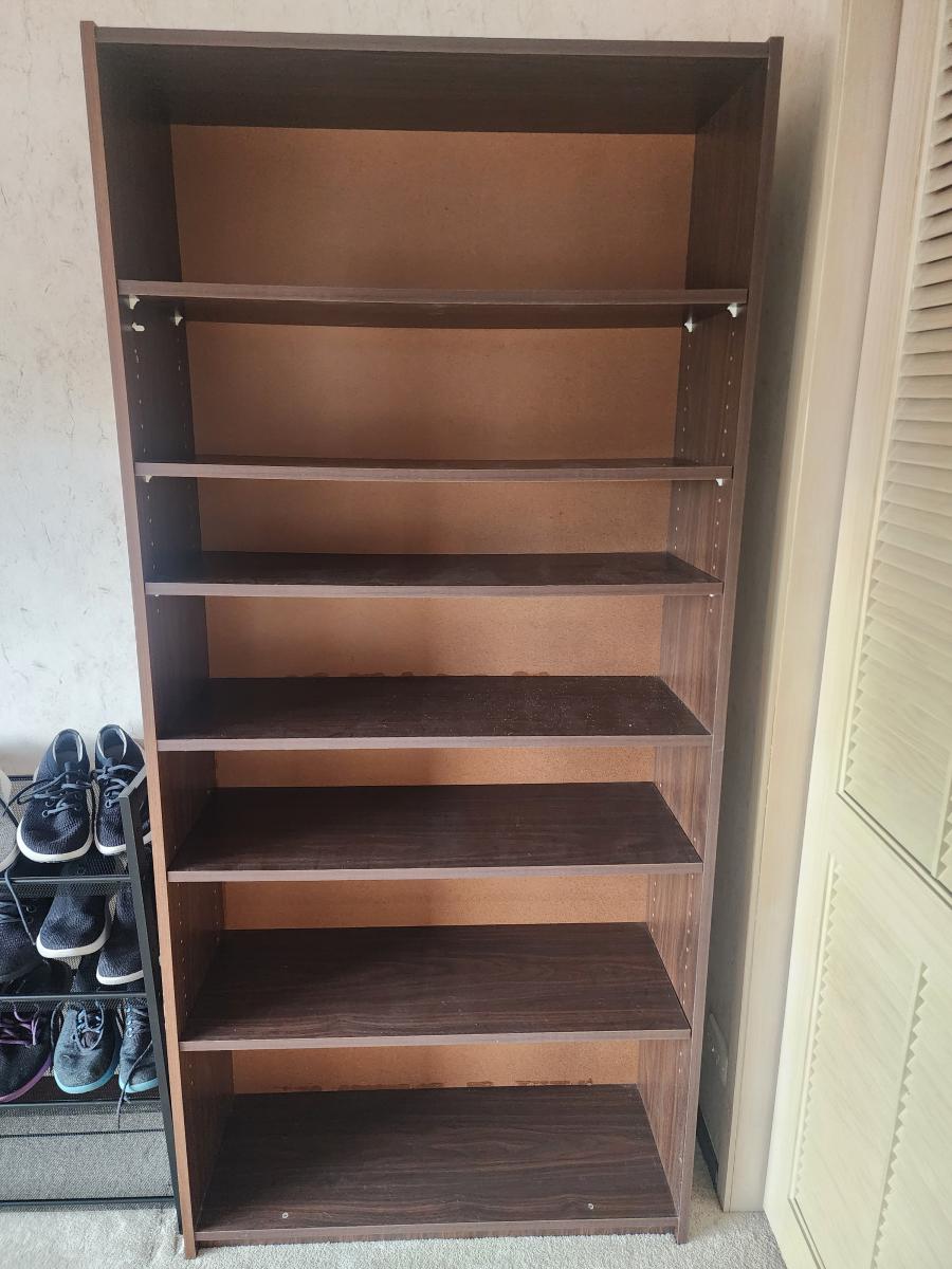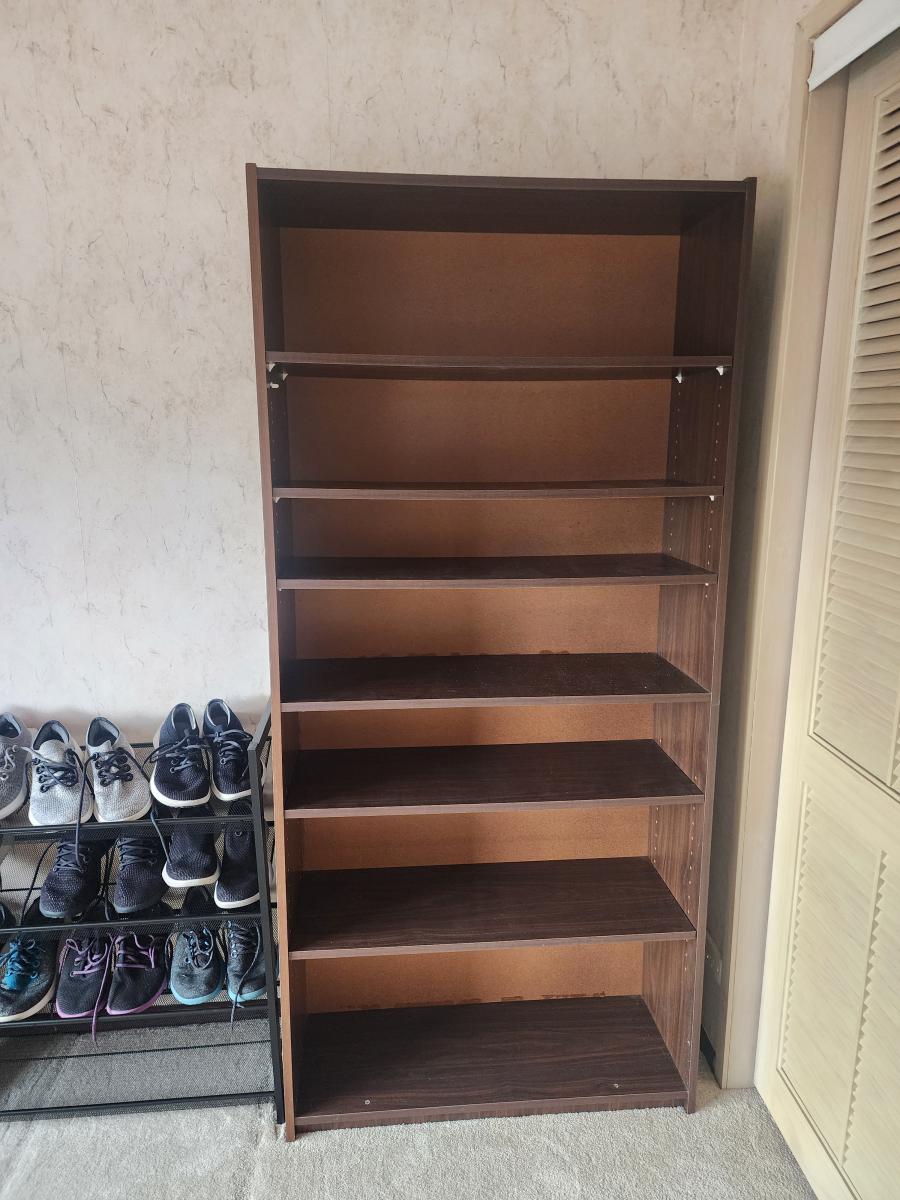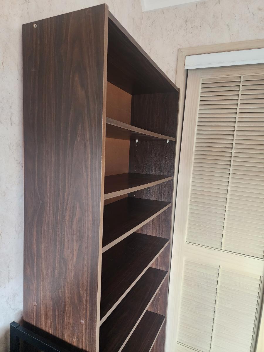 … View moreDark brown solid wooden full size bookcase in great condition
