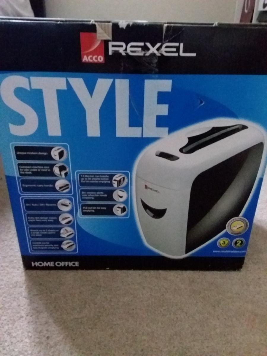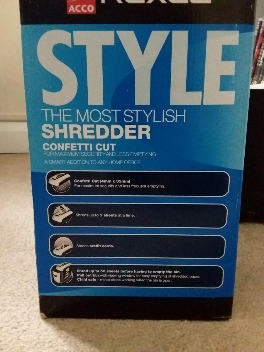 Rexel shredder shreds up to 5 sheets t a time. Has a UK plug so will need adaptor.