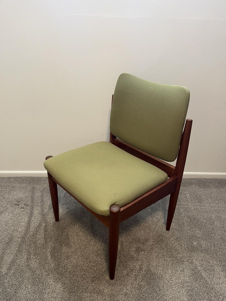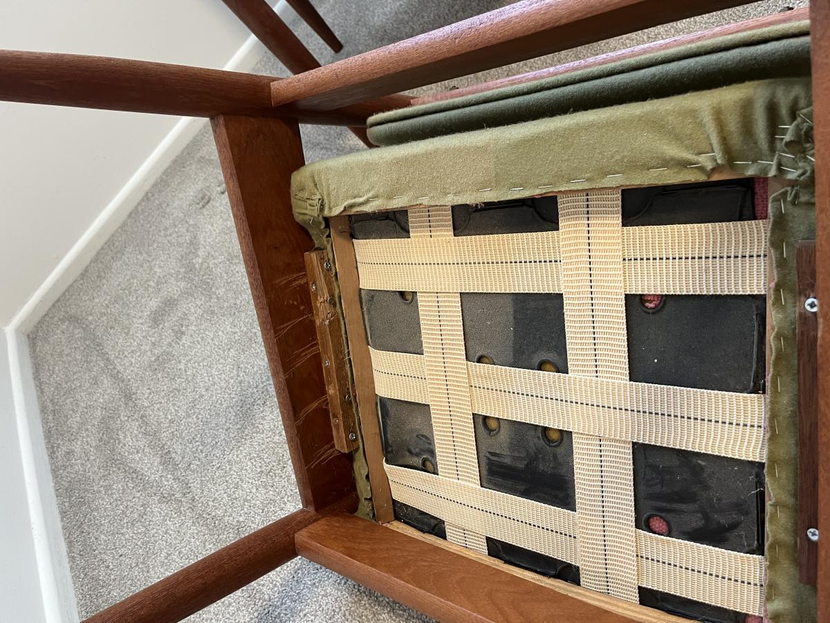 At the time of purchase I reupholstered them with the sage green canvas material and sanded and restored the timber. I’ve always been unsure of the timber but did think it was teak for a while so used oil suitable for that.