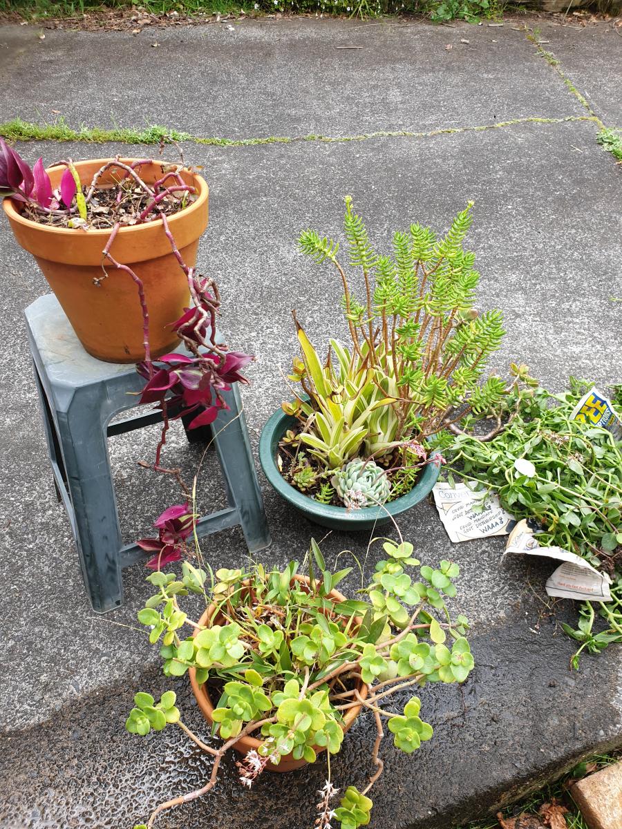 Free ready to go. Bromeliads succulents pretty pink ground cover and 3 pot plants.
