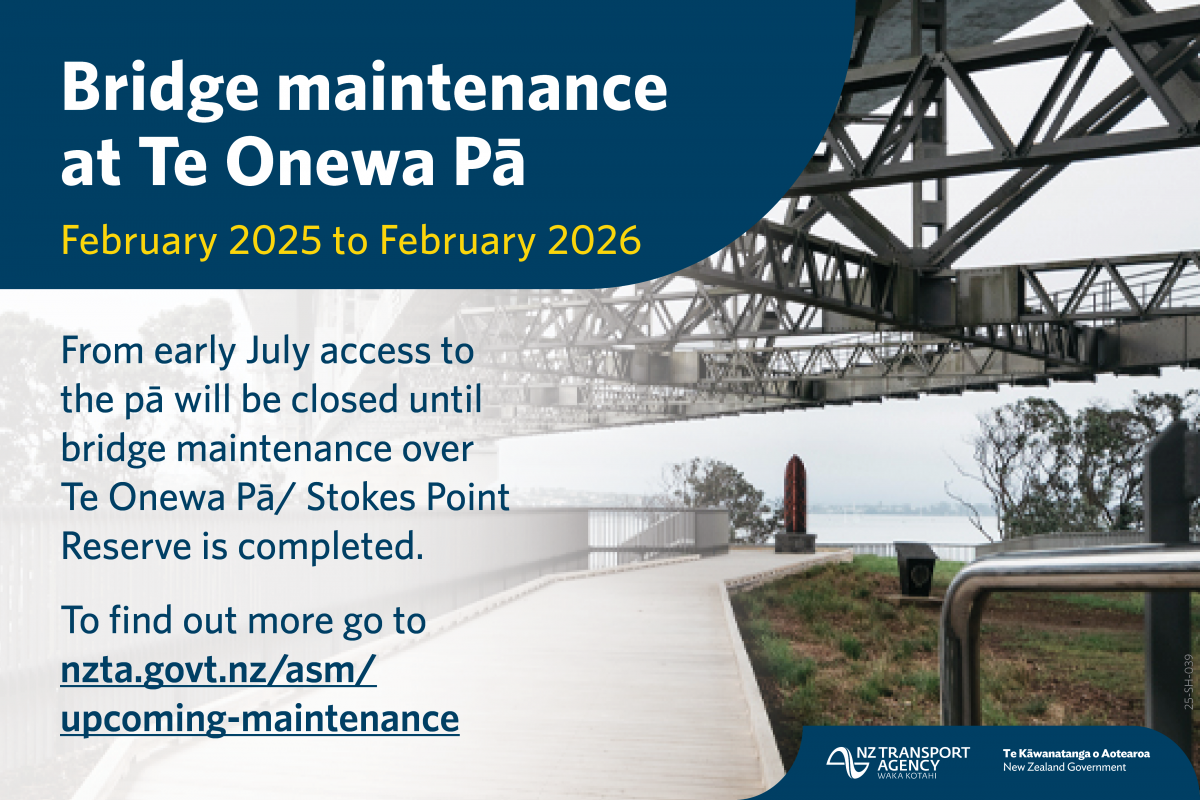 From July 2025, access to Te Onewa Pā at Stokes Point Reserve will be closed until early 2026 due to essential maintenance on the underside of SH1 Auckland Harbour Bridge. Visit the NZTA website to find out how you might be affected. Find out more