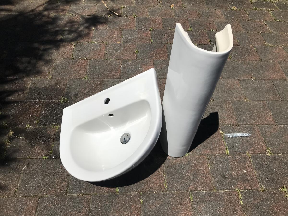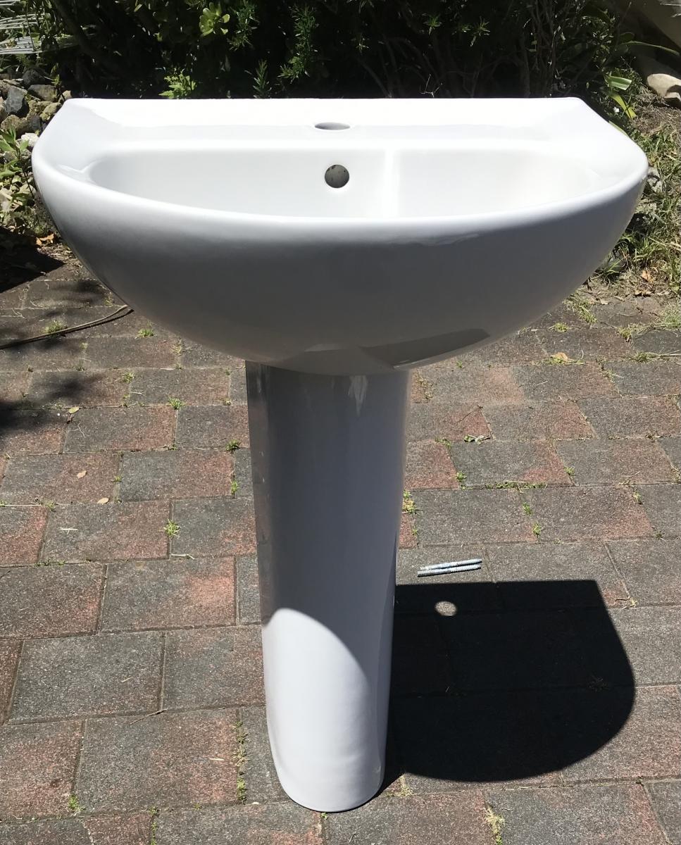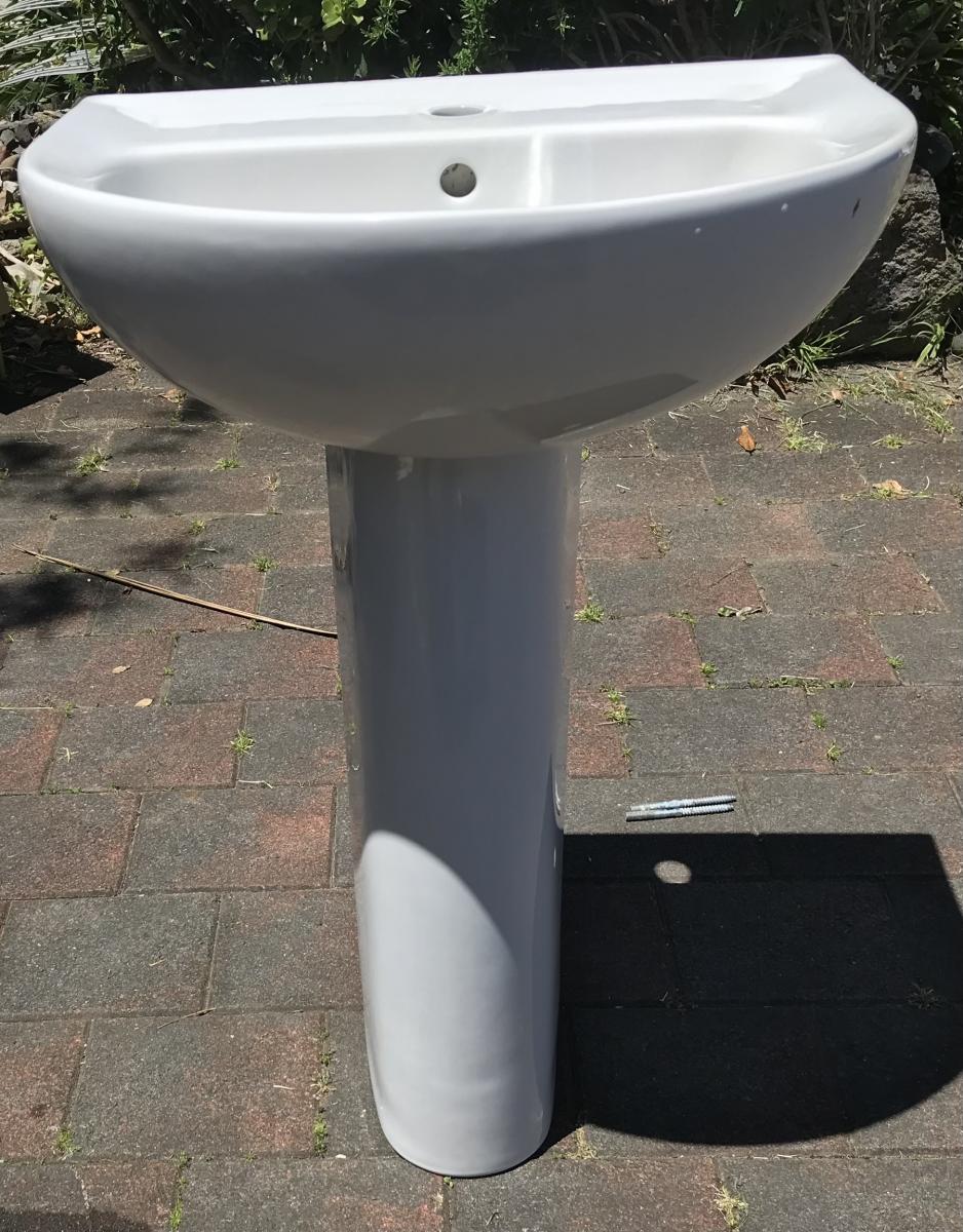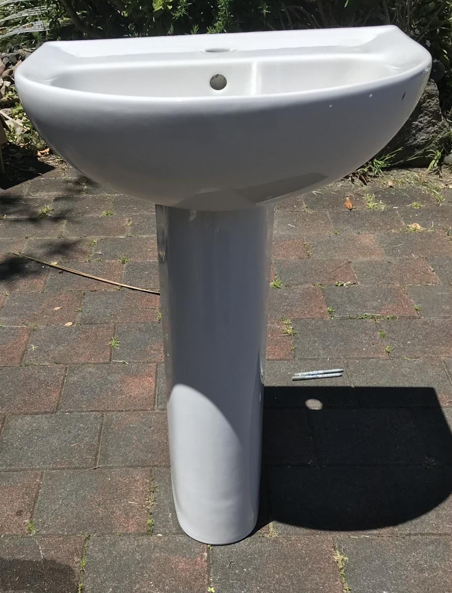 Free standing porcelain basin and pedestal with plug. Comes with 2 bolts to affix. Pedestal 68 cm high. With basin 84 cm high. Has some small marks which could be cleaned off.Due to size pick up only.