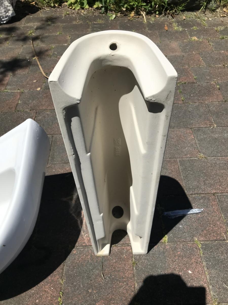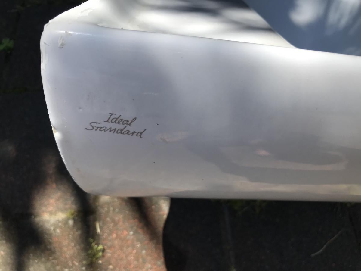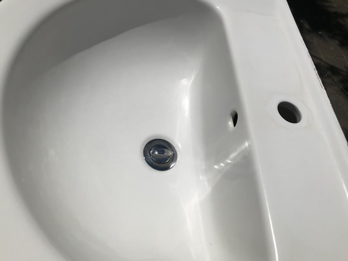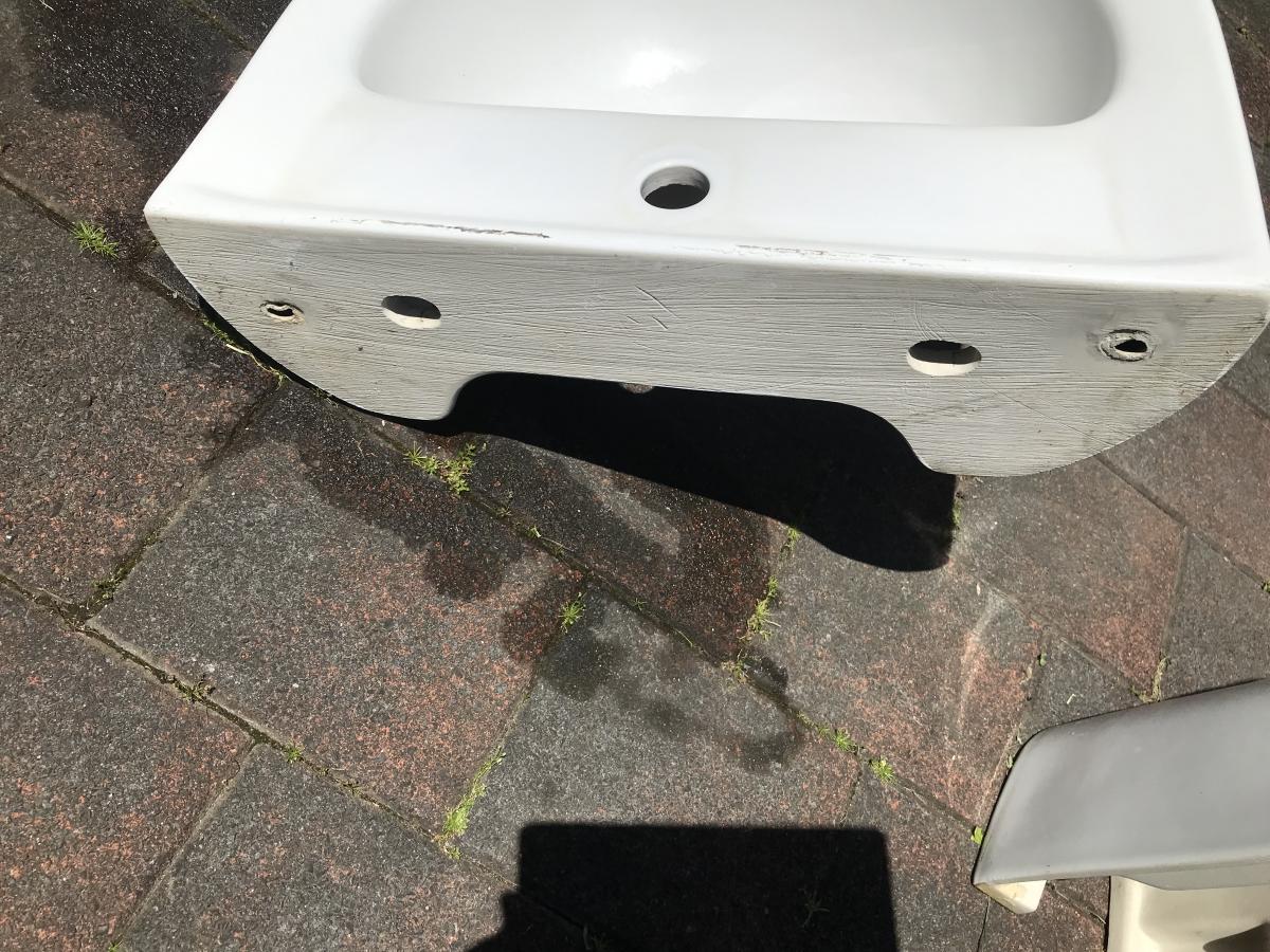 Free standing porcelain basin and pedestal with plug. Comes with 2 bolts to affix. Pedestal 68 cm high. With basin 84 cm high. Has some small marks which could be cleaned off.Due to size pick up only.