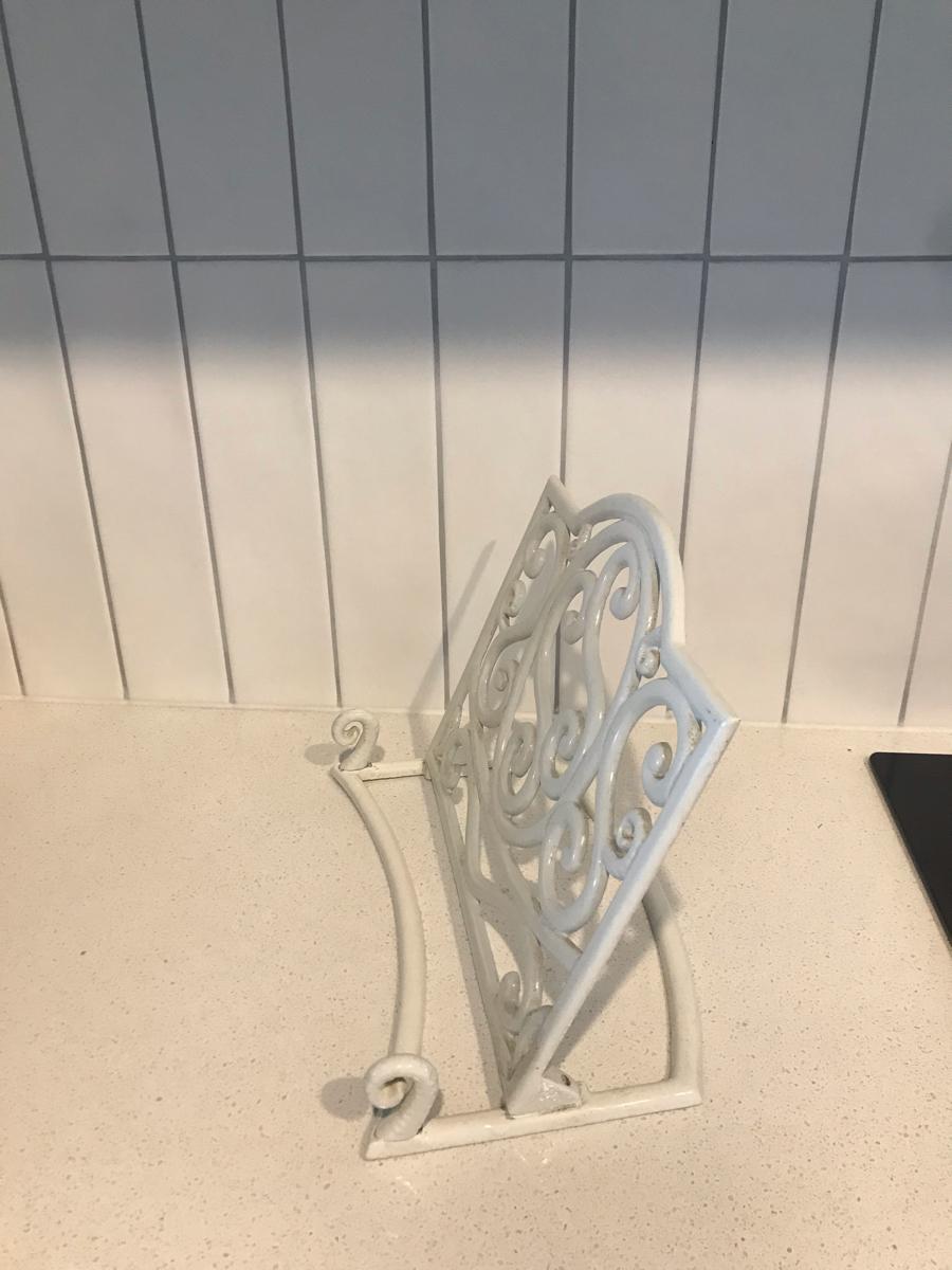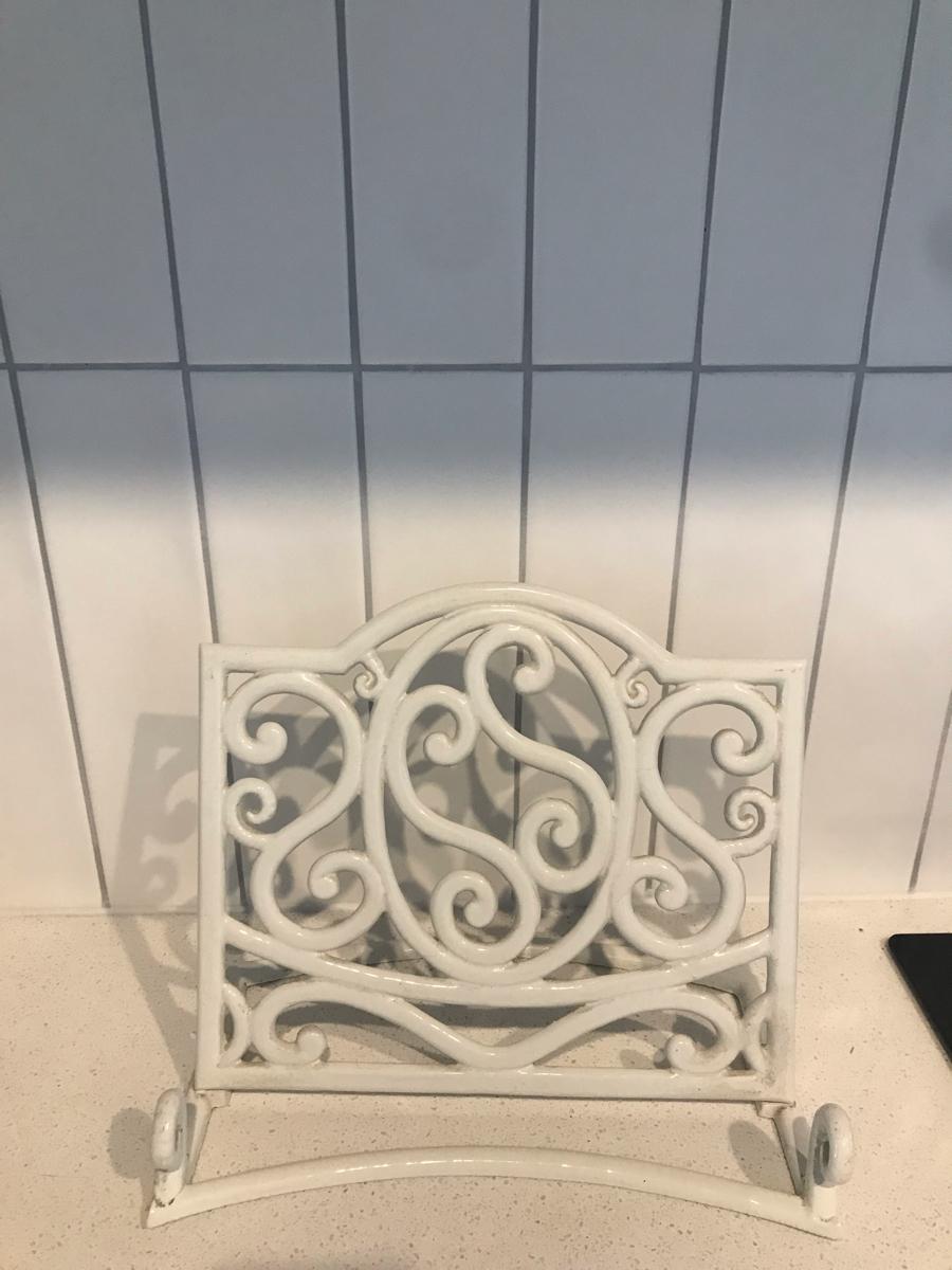 Cast iron white recipe book holder. Very sturdy. In excellent condition. No damage. Pick up flat bush.