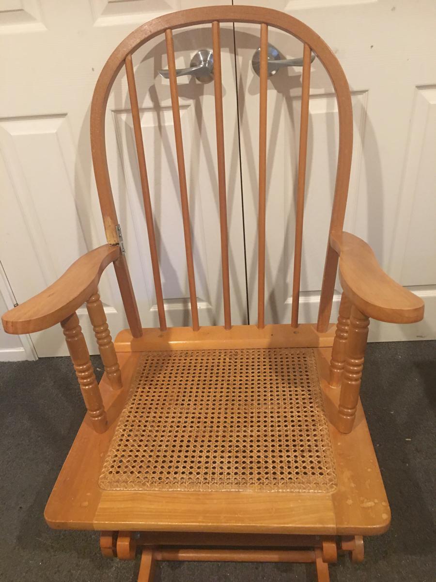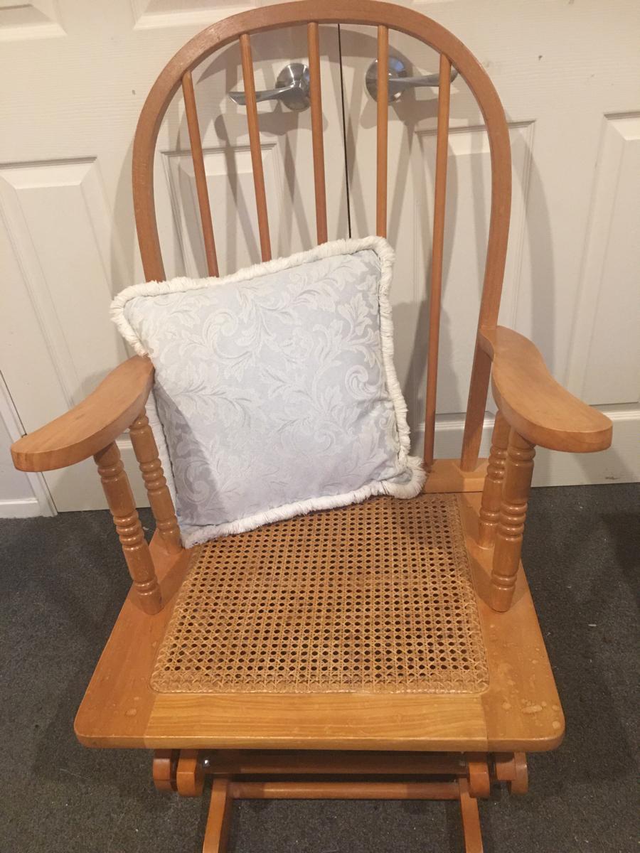 No longer required - very comfortable - rocks - has had a repair done to it (refer to the second photo), but not visible with the cushion over it (refer to first photo).
