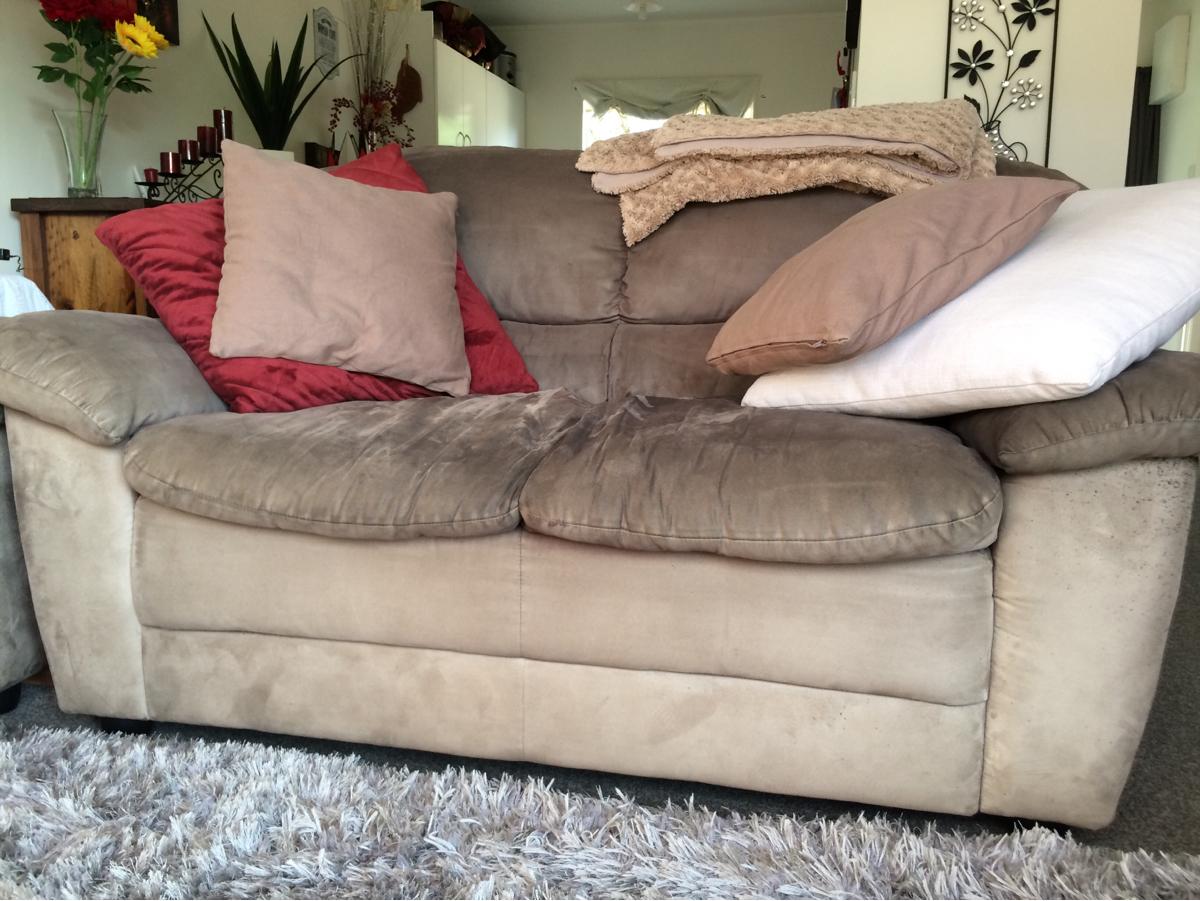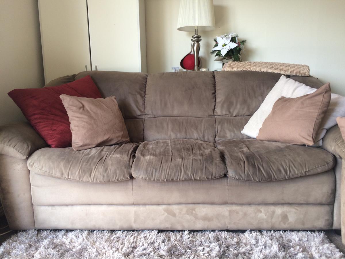 3 seater and 2 seater lounge suite. Mushroom colour. Will throw in two blankets and 8 cushions. Excellent condition, smoke free home. $275.00. We are Covid19 free. Have not been sick.