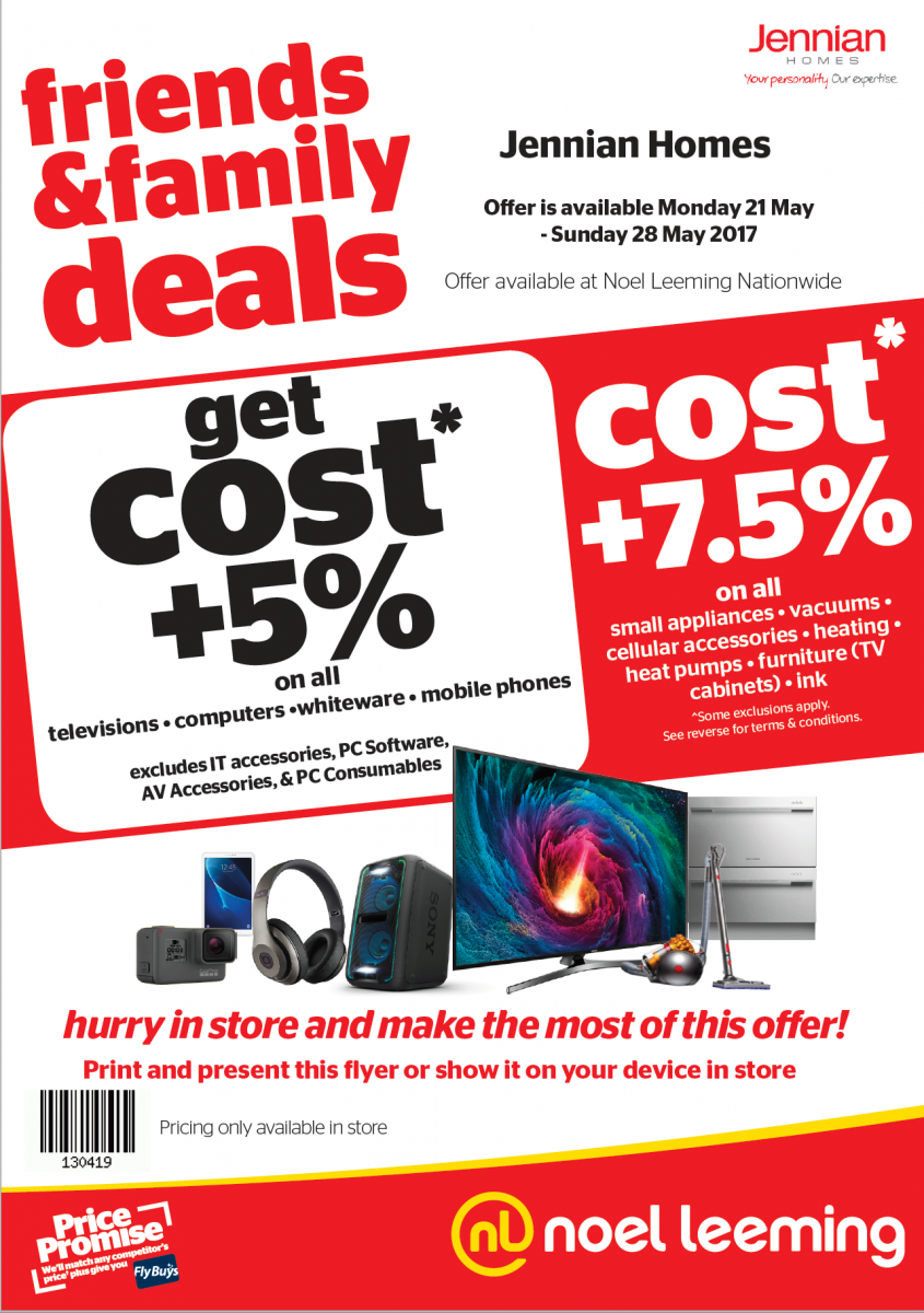 Whether you are after a TV, Computer, Whiteware or a Mobile phone, Present this flyer to our good friends at Noel Leeming and bag a bargain with cost +5% storewide as well as cost +7.5% on all Small Appliances, Vacuums, Cellular Accessories, Heating, Heat pumps & furniture.