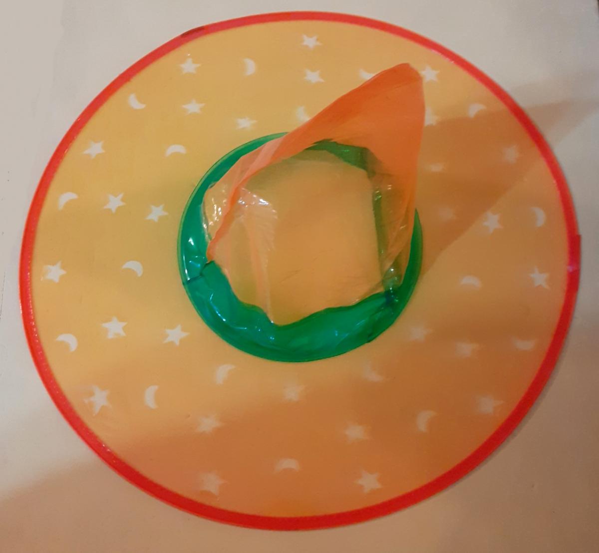 A set of Halloween Costume comprising of Orange Witch Hat, mask and Cape. The hat and cape have been used before but the mask has never been worn before. Some of the bats sticker on the cape are sticking together for being stored in the cupboard for years.