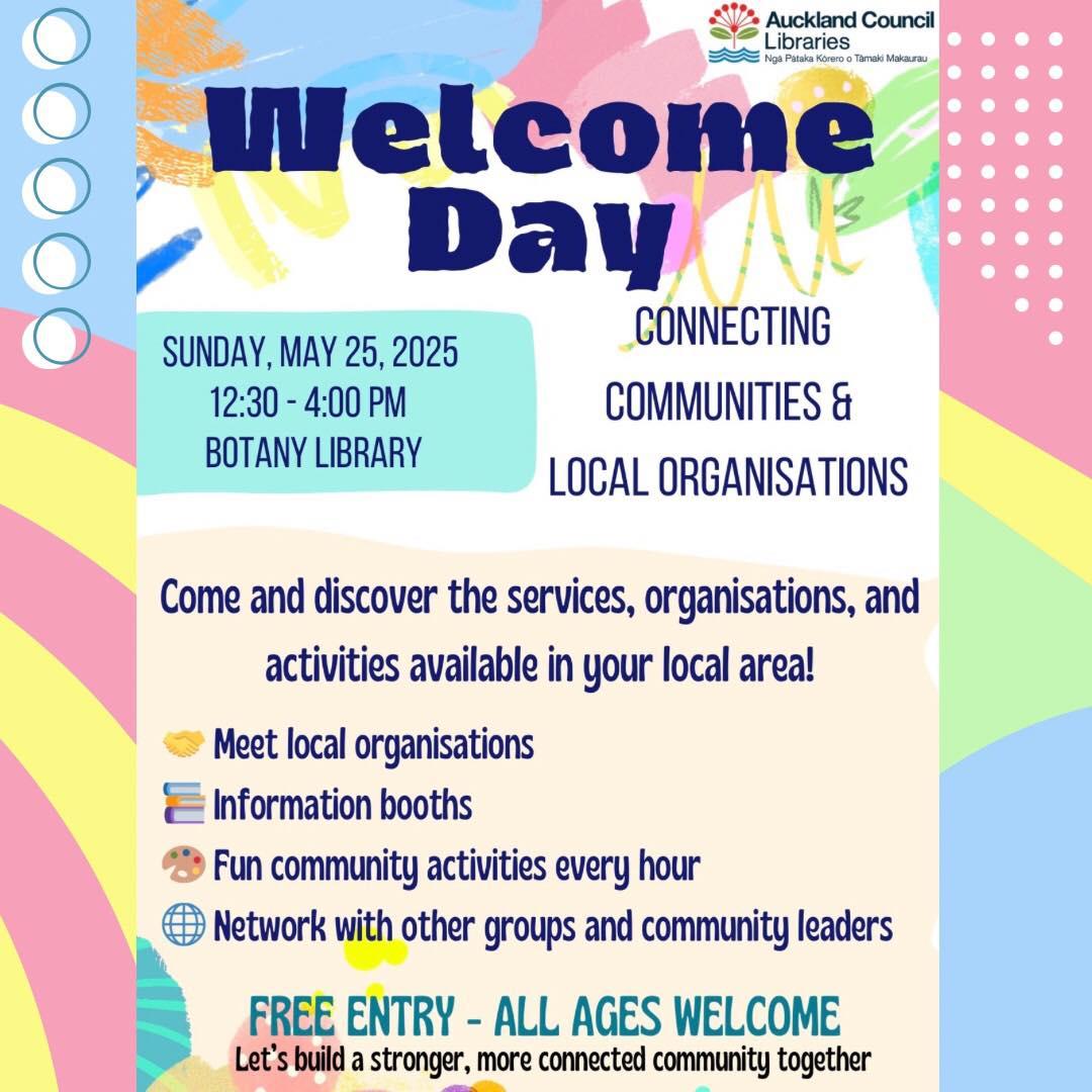 Come on down and say hello! We'll be there alongside lots of other fantastic community groups, ready to chat and share how we can … View moreHey Botany whānau! 👋 We're really looking forward to being part of the Welcome Day at Botany Library on Saturday, May 25th, from 12:30 PM to 4:00 PM!