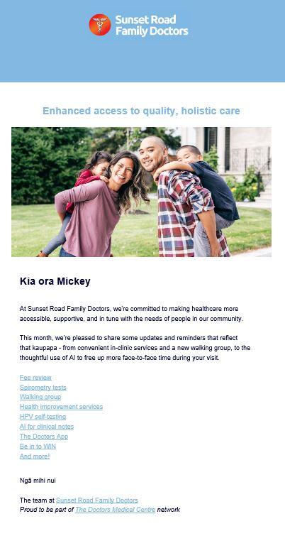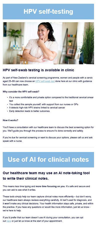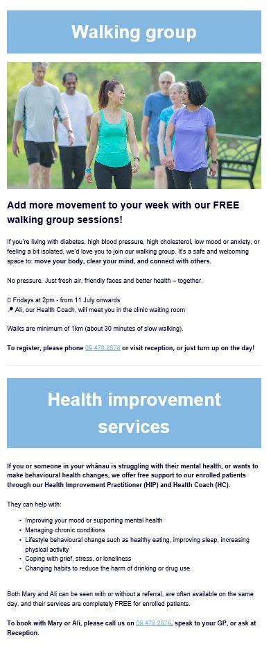 This month, we’re pleased to share some updates and reminders that reflect that kaupapa - from convenient in-clinic services and a new walking group, to the thoughtful use of AI to free up more face-to-face time during your visit.