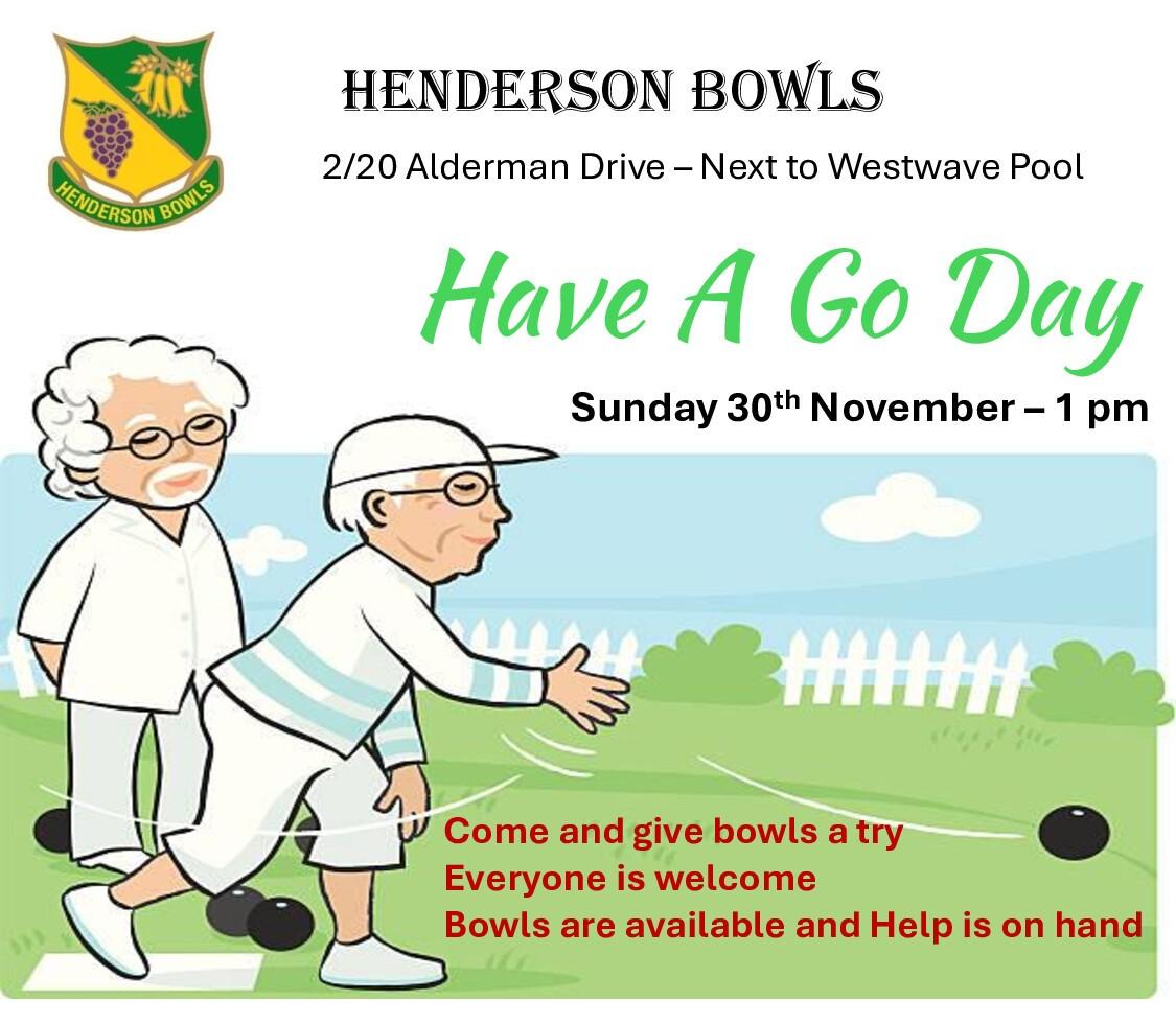 Henderson Bowls is having a "Have A Go Day" on 30th November starting at 1.00 pm. Come down to the club to give lawn bowls a try, and bring as many friends as you can to share this interesting sport.