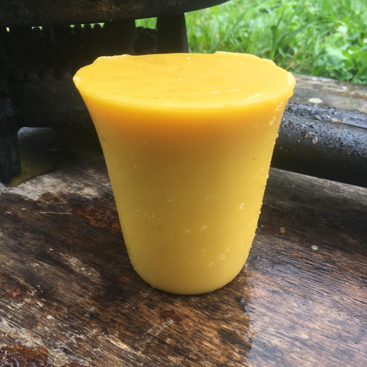 Wax blocks are made from the scrapings off the tops of bee hive frames, and from the wax cappings that are removed during the honey extraction process. These all get melted down and filtered to get out brood husks, dead bees, and other rubbish. Once this is cooled it is melted a second time to remove further impurities and poured into smaller molds for sale.