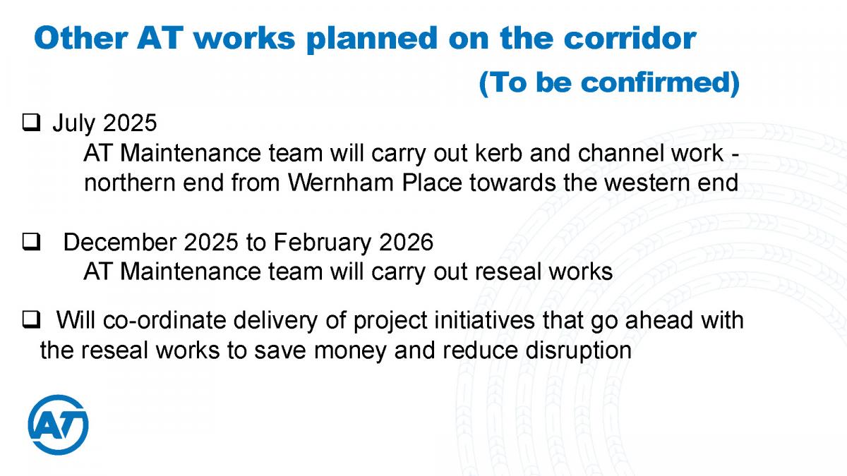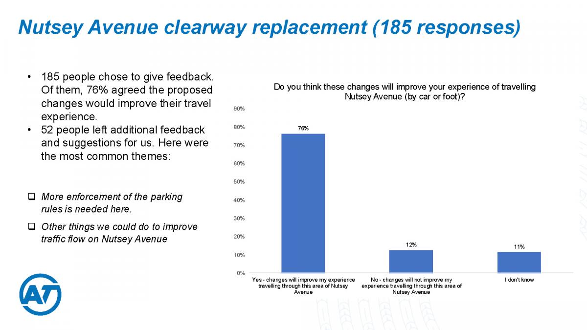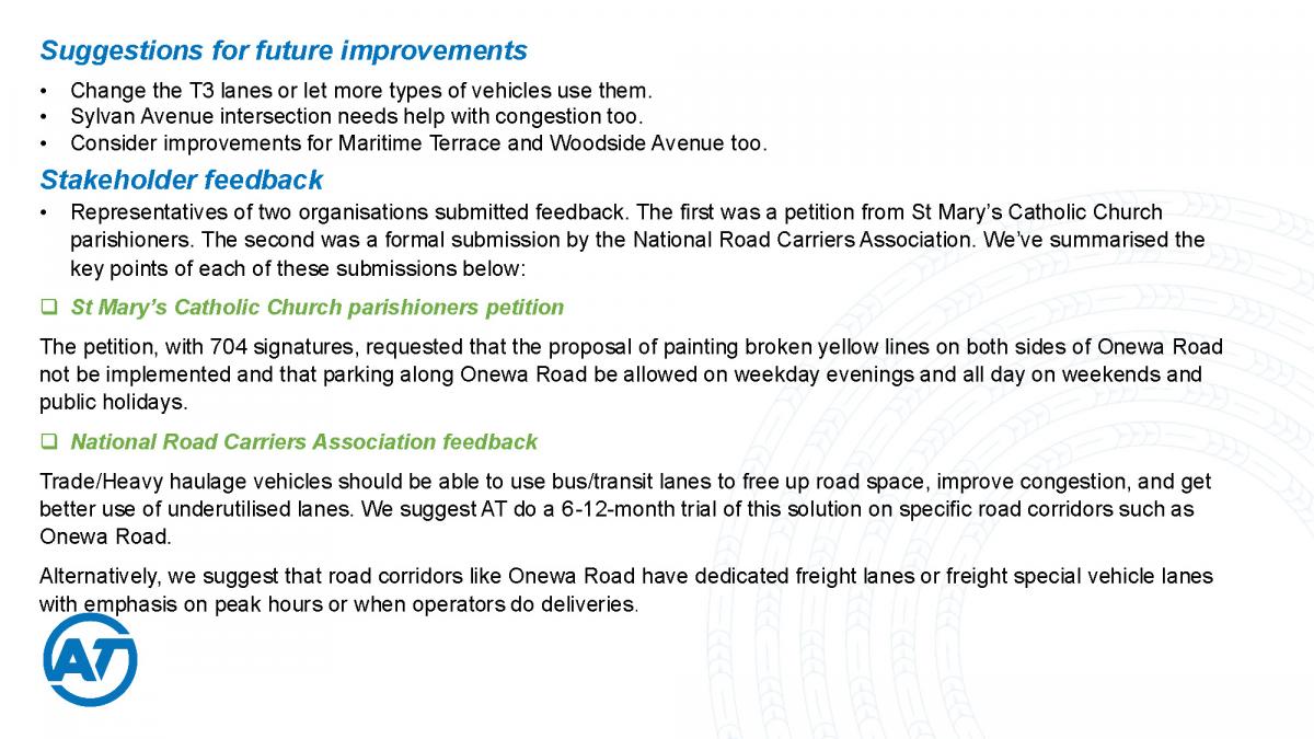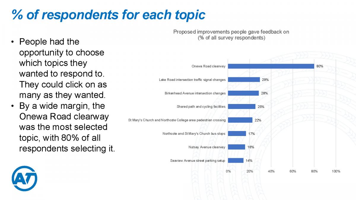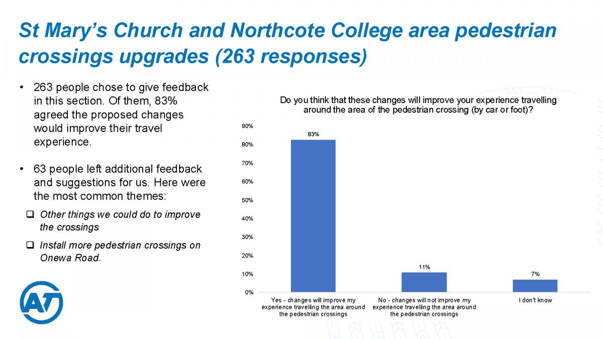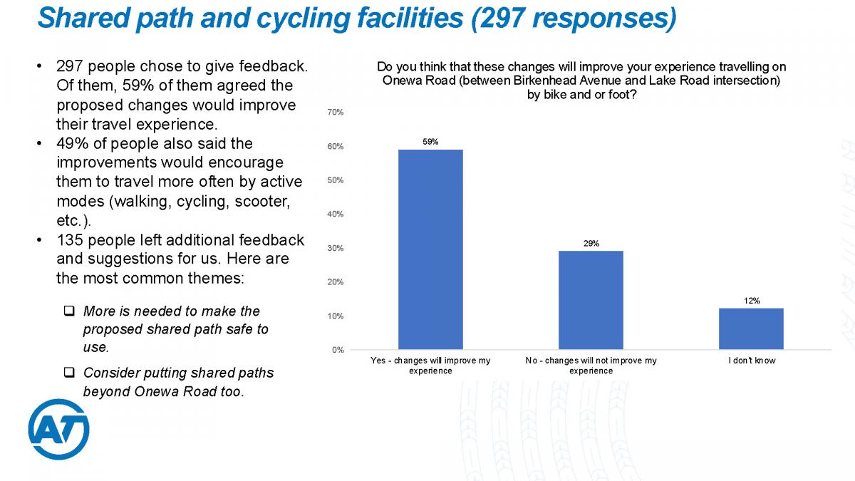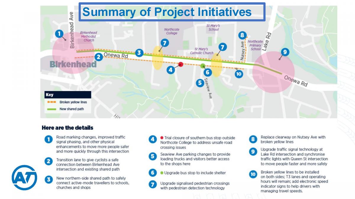 Last week Auckland Transport met with the Kaipātiki Local Board to discuss the results. The slides from their presentation slides are attached. Note that AT are no longer recommending removing the bus stop opposite Northcote College.