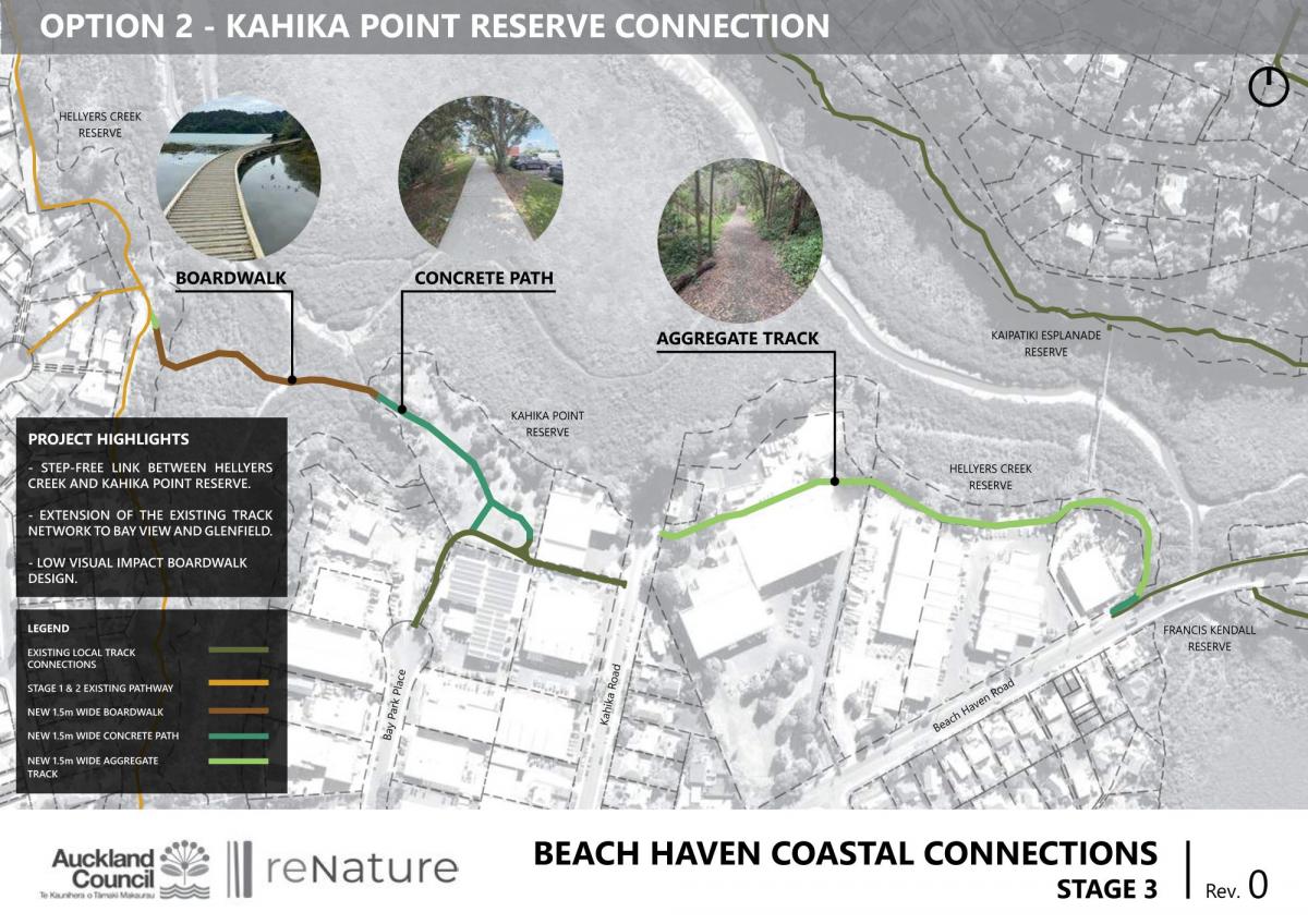 ➤ Option 2: a path to connect Hellyers Creek Reserve with Kahika Point Reserve in Birkdale, and around the coast to the Kaipatiki Rd bridge.