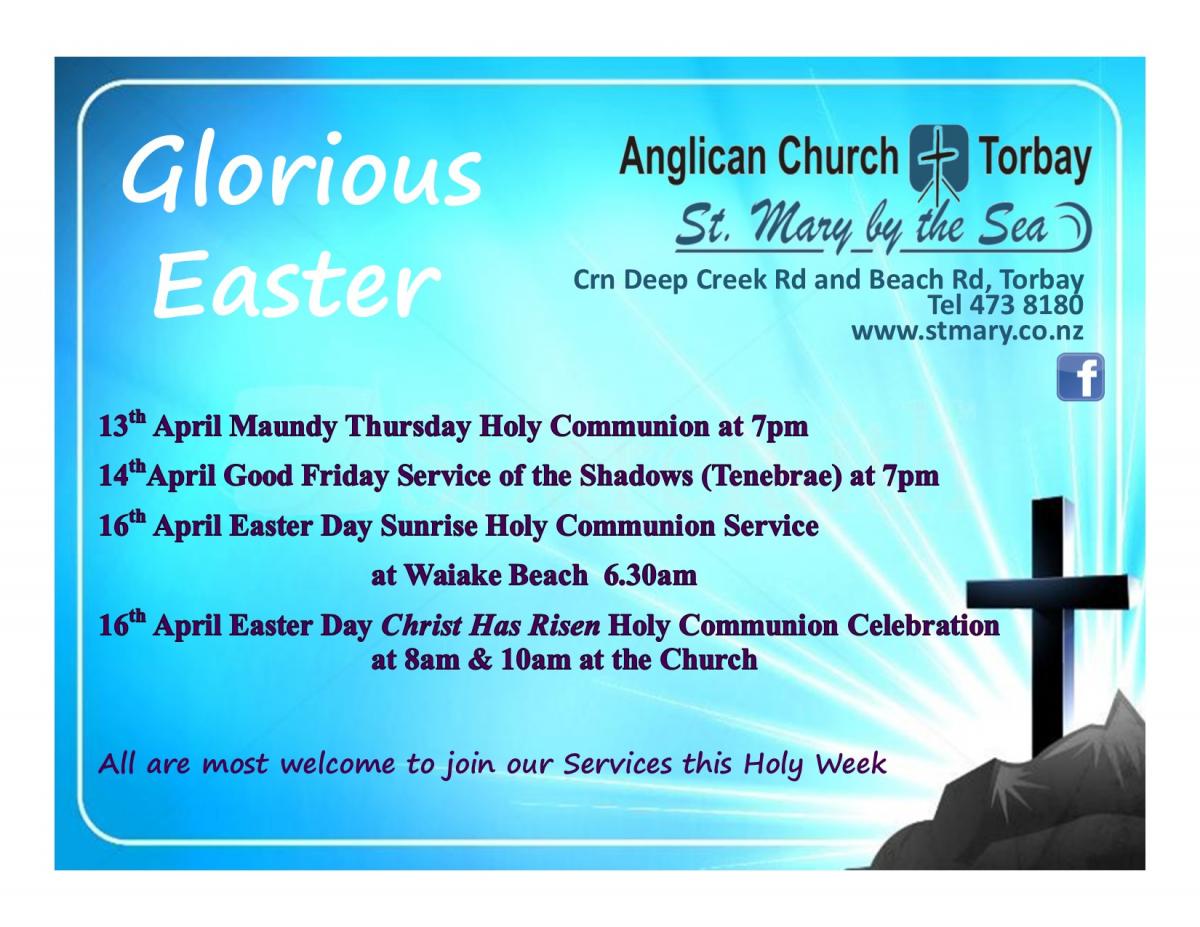 16th April Easter Day Sunrise Service and Holy Communion at Waiake Beach 6.30am (Hotcross buns and drink afterwards if weather permits)