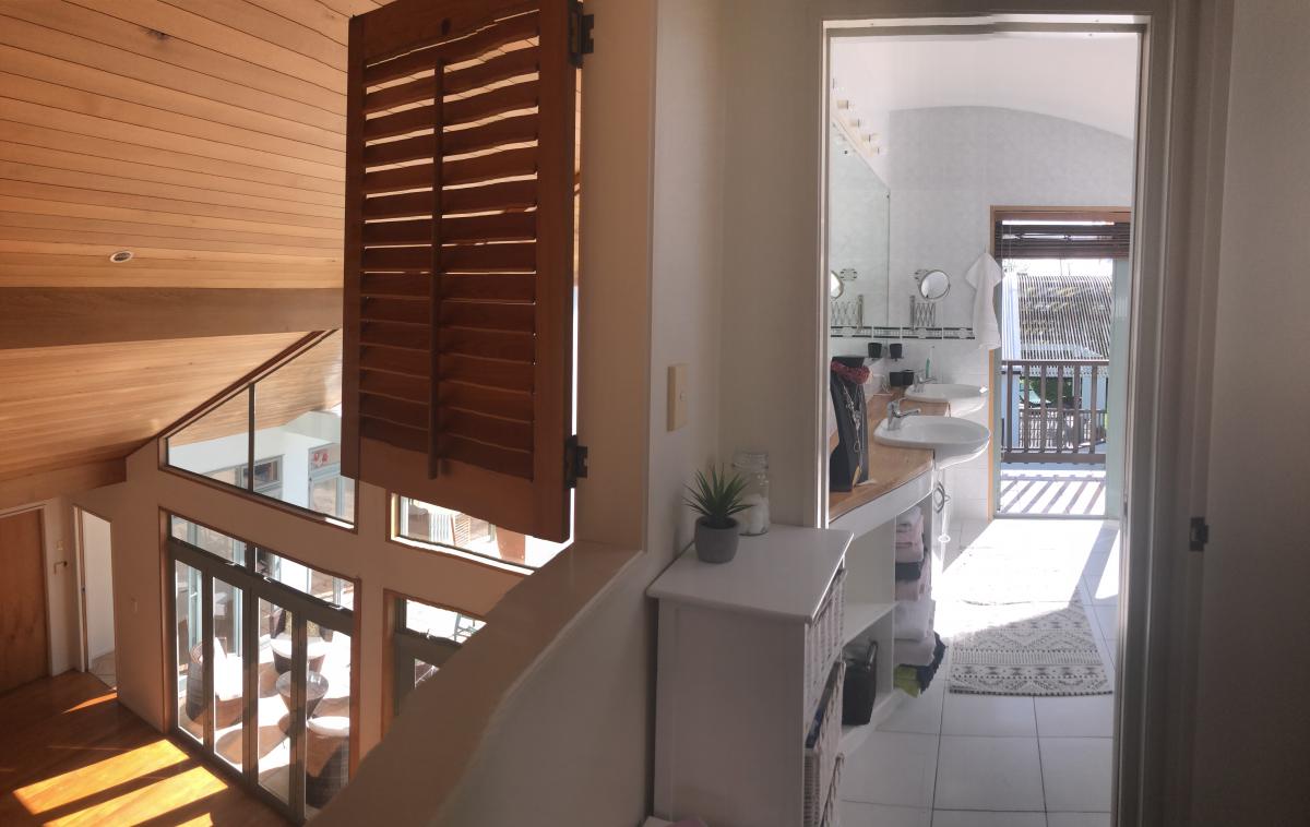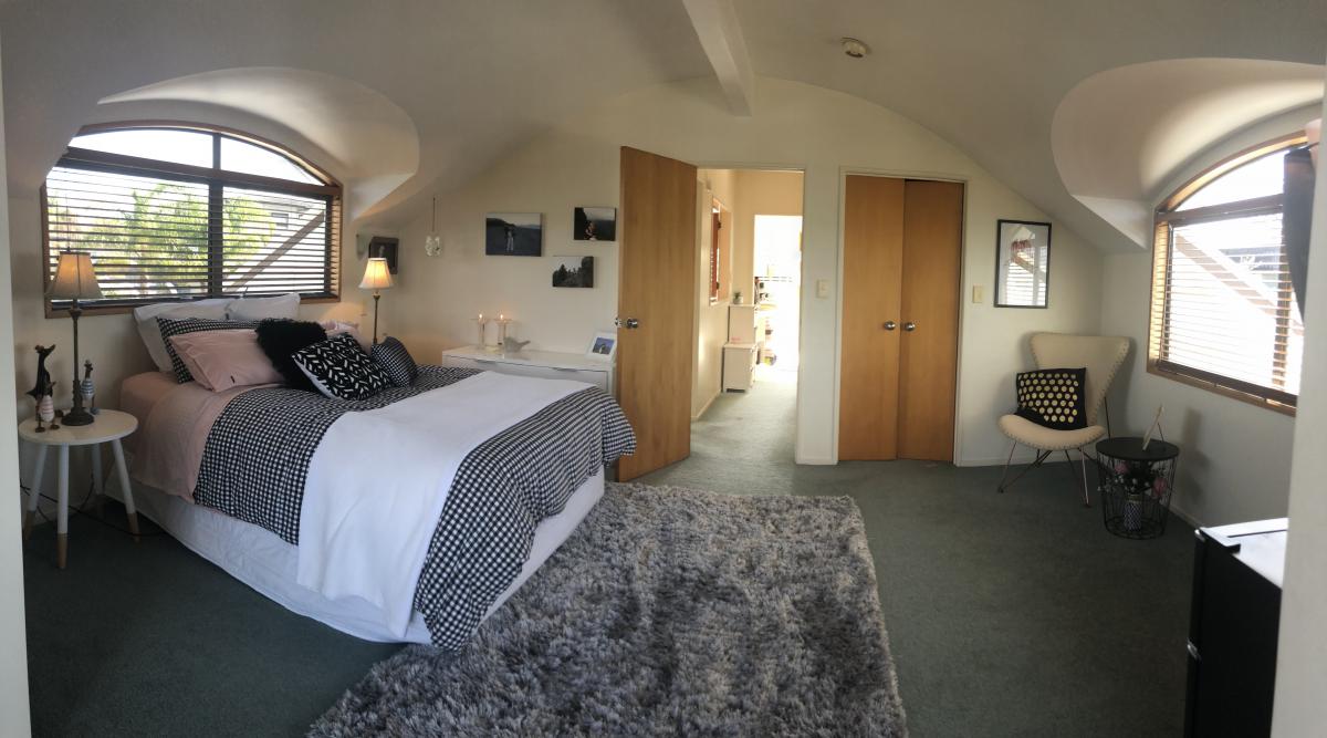 The room is private,… View moreBig and private upstairs en-suite with two balconies, one turning out to the swimming pool and the other with Sea-view to Rangitoto. Own toilet and bathroom with spa. Big bedroom with a queen bed, lounge, office/deck, fridge/freezer, TV with Netflix/ light box and internet.