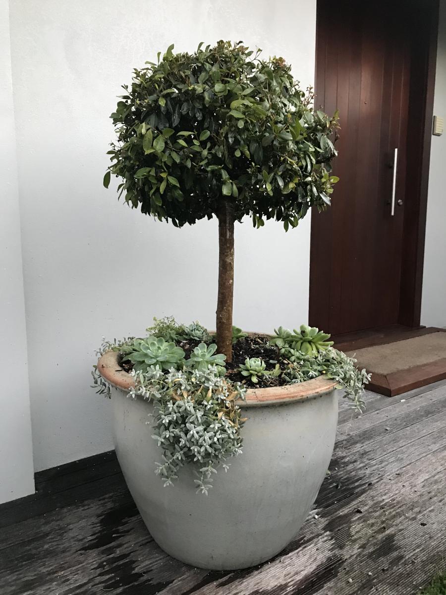 We are down sizing and all my topiary plants are going. This lilli pilli is apx 10 years old. It is a really hardy tree and looks great with under planting or Christmas lights. I have just put succulents around it and snow in summer. Height 124cm Width 65cm.