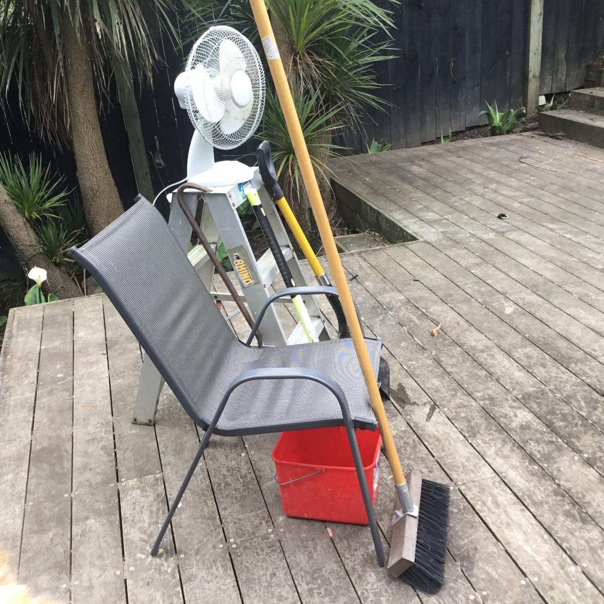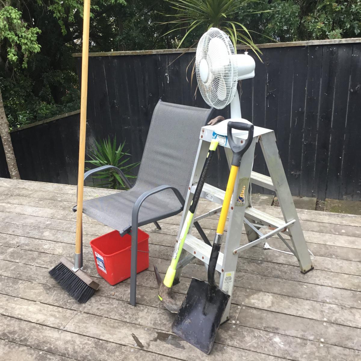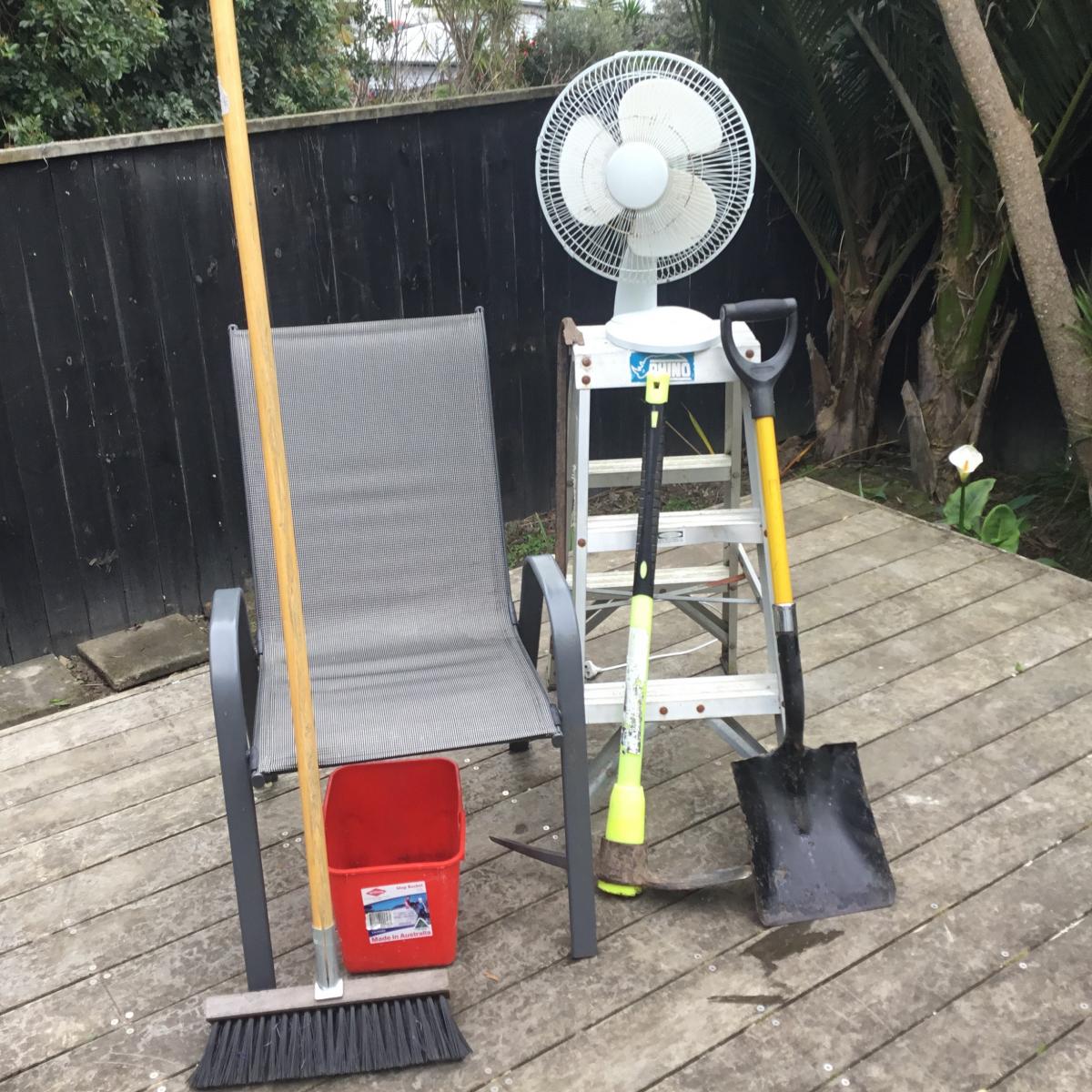 Fan for summer plus nice outdoor chair step ladder crowbar shovel mattock etc all in picture, yes if local can drop off.