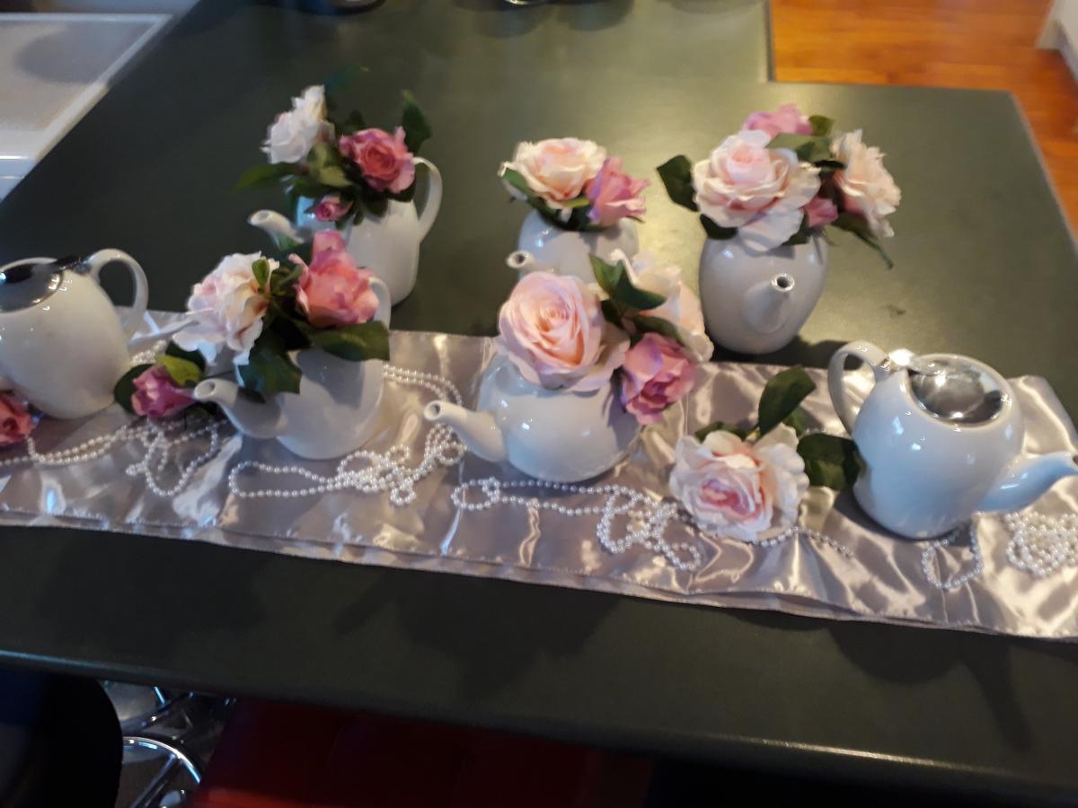 I set this up for my mums 80th Birthday. Assortment of Tea Pots with & without lids, flowers, pearls and 1 x silver runner. Wanting $60 for the lot