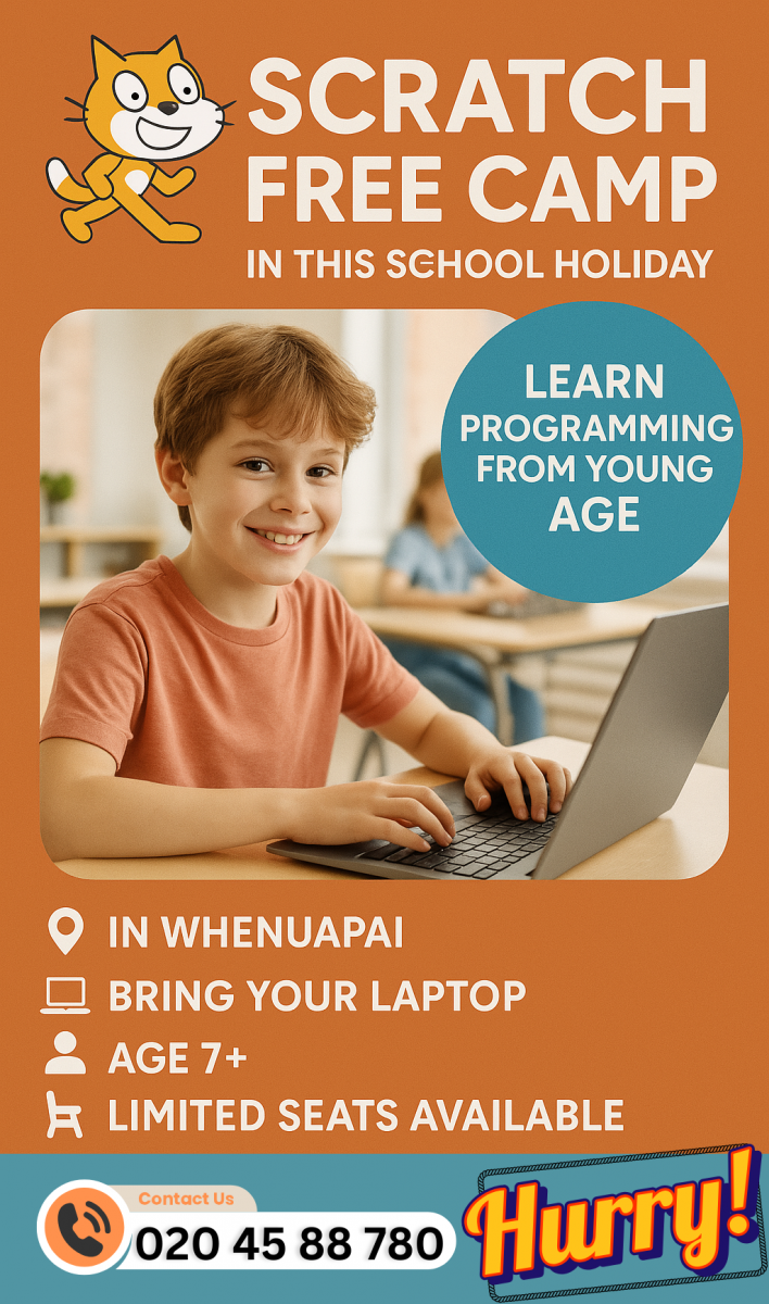 🎮 Learn programming from a young age and start building your own games using Scratch! This fun and interactive camp is designed to spark creativity and… View moreWe're running a Scratch Free Camp in Whenuapai — the perfect opportunity for kids aged 10+ and up to dive into the world of coding! 💻