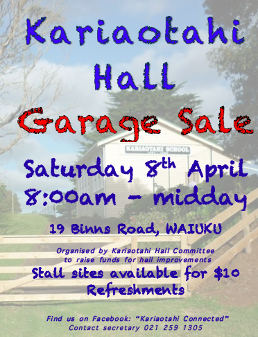 A reminder that our Kariaotahi Hall garage sale is on Saturday April 8. Follow the road from Waiuku to Karioitahi surf beach - you can't miss us. We are the last road on the left before the beach. Lots of bargains. Clothing, bric-a-brac, home preserves, books, household goods, toys, raffles, … View moreA reminder that our Kariaotahi Hall garage sale is on Saturday April 8. Follow the road from Waiuku to Karioitahi surf beach - you can't miss us. We are the last road on the left before the beach. Lots of bargains. Clothing, bric-a-brac, home preserves, books, household goods, toys, raffles, home-made morning tea. All proceeds go towards the maintenance and restoration of the former Kariaotahi School, built in 1931, which is now the local hall.