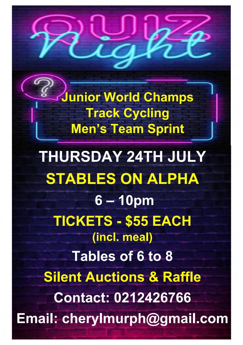 Last chance to book a seat or a table at next Thursday's Junior World Champs, Team Sprint Quiz Night fundraiser to help our 3 local Waikato lads - Flynn Underwood, Alex Schuler and Ben Murphy, fund their way to The Netherlands in less than a month's time!