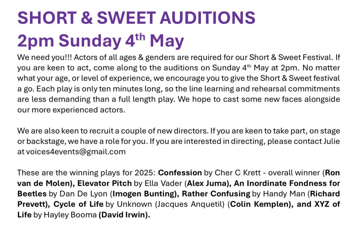 AUDITIONS for 6 x short 10-minute plays. Come along to act, direct or help out. All welcome. Friendly atmosphere.