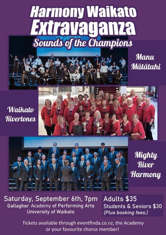 A feast of four-part harmony from the Waikato's best barbershop choruses and quartets. Mighty River Harmony is New Zealand's top men's chorus with strong vocals and powerful bass section. Manu Mātātahi is one of this country's leading mixed youth choruses with impressive, … View moreA feast of four-part harmony from the Waikato's best barbershop choruses and quartets. Mighty River Harmony is New Zealand's top men's chorus with strong vocals and powerful bass section. Manu Mātātahi is one of this country's leading mixed youth choruses with impressive, tight harmonies. The Waikato Rivertones women's chorus has won international praise for its spectacular performances. Quartets include gold medal winners The Usual Suspects along with Centreplace and Four Square.